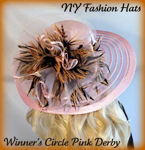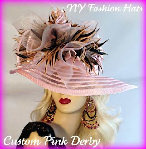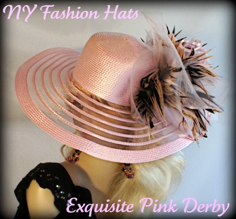 Ladies Soft Pink Designer Sheer Wide Brim Fashion Haute Couture Kentucky Derby Horse Racing Hat Embellished With Pink And Brown Striped Tiger Type Feathers. A Large Pink Horse Bow And A Pink Organza Bow With Pink Satin Edging Is Mixed Into The Feather Mix. This Romantic Styled Avant Garde Hat, Will Make Any Women Feel Feminine. This Dress Hat Is Suited For A Bride To Be On Her Wedding Day, Or For Wedding Guests. This Dress Hat Is Suited Also For Church, Weddings, Formals, Holidays And Special Occasions.