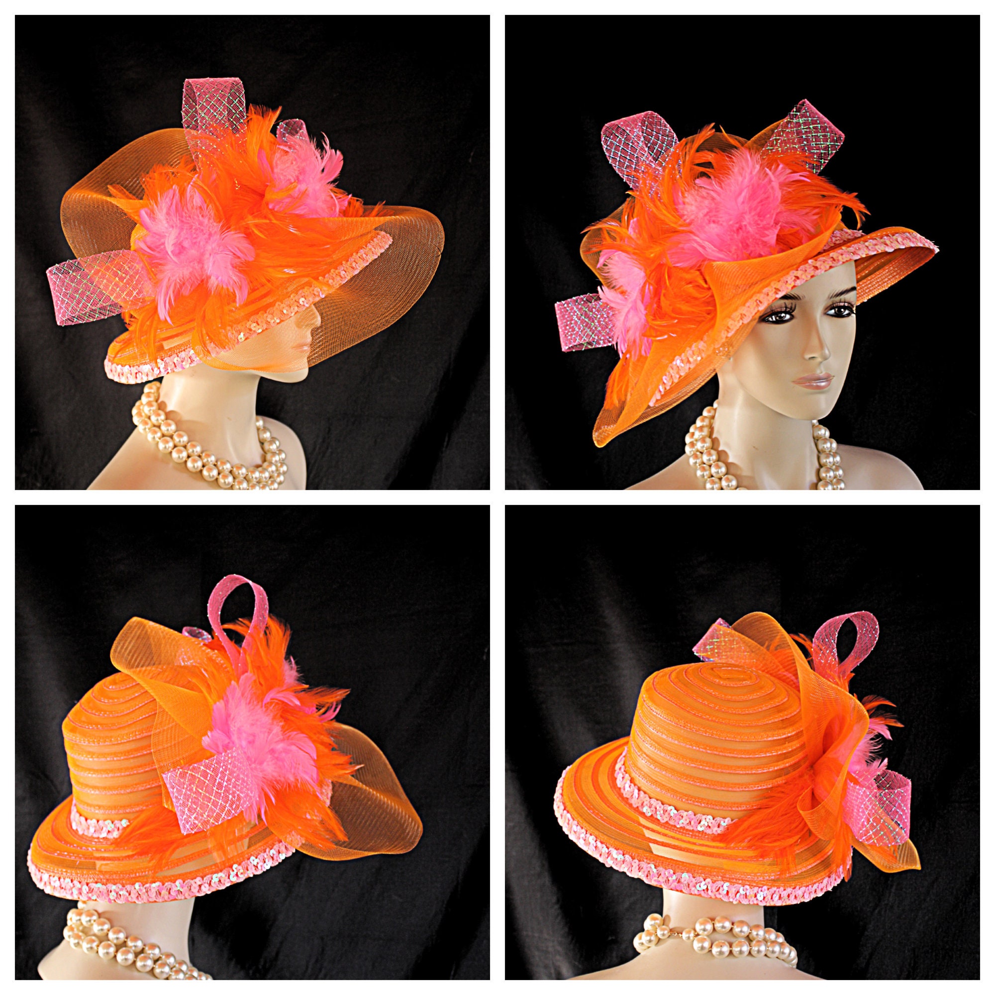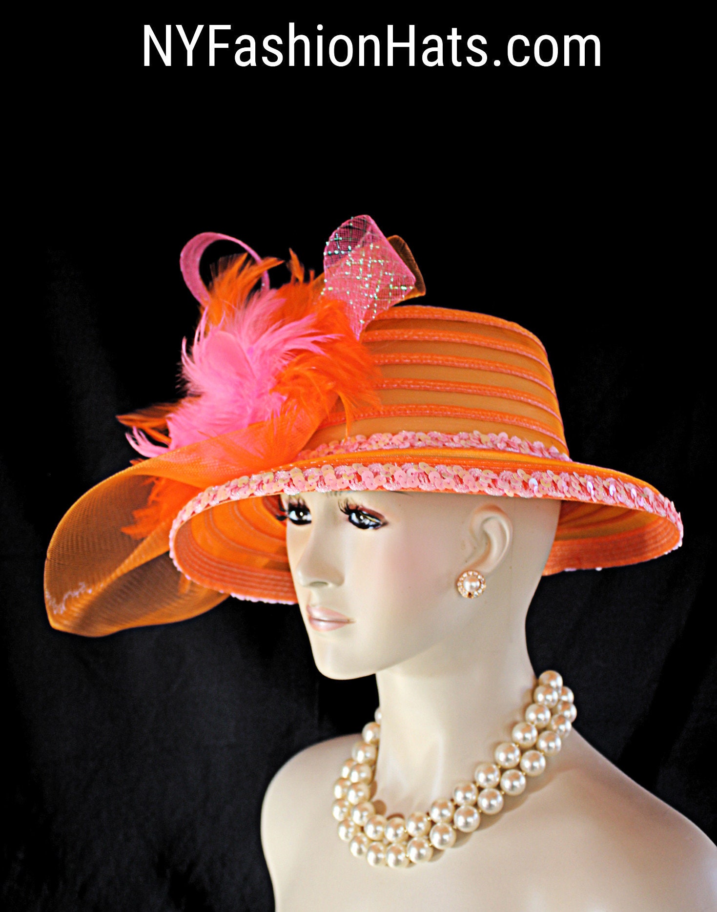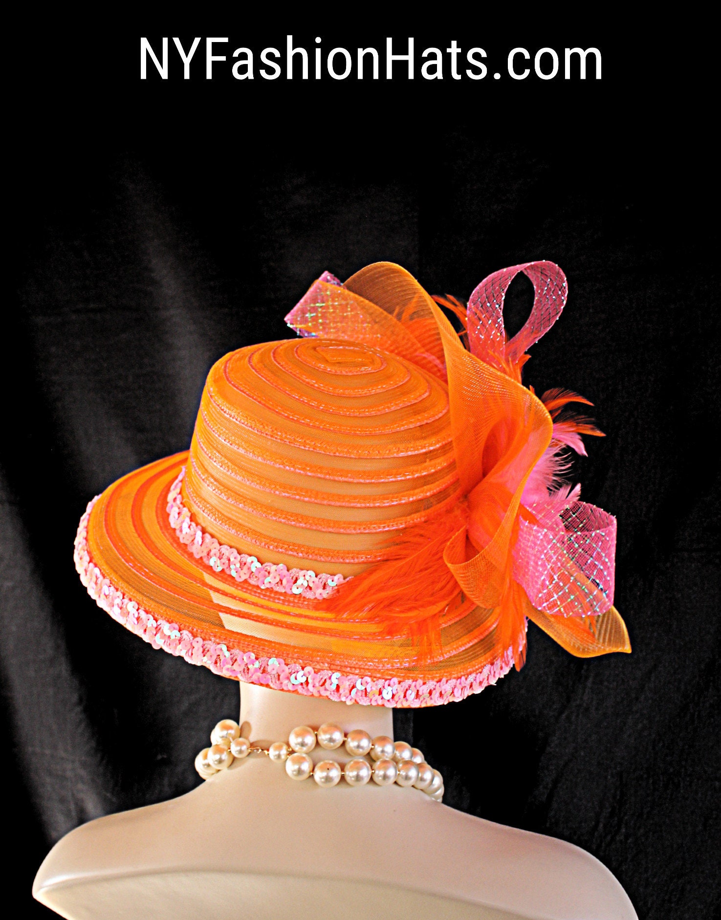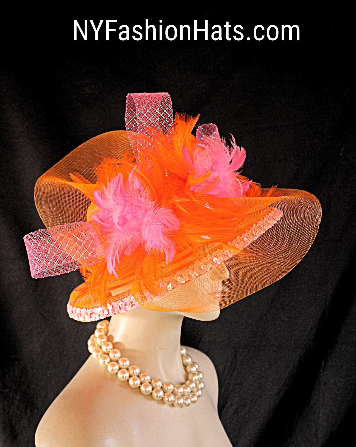 Haute Couture Orange Sheer Designer Fashion Hat For The Kentucky Derby Formals Weddings And Special Occasion. This Custom Designed Women’s Dress Hat Is Trimmed With A Large Sheer Orange Horsehair Crinoline Bow Mixed With A Hot Pink Metallic Silver Horse Hair Bow. Placed Within This Beautiful Large Bow Are Orange And Hot Pink Rooster Hackle Feathers. A Decorative Pink Sequin Trim Is Placed Around The Lower Portion Of The Crown And Along The Brim.
