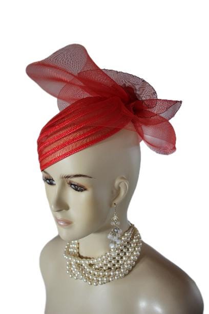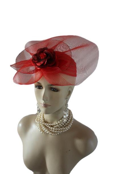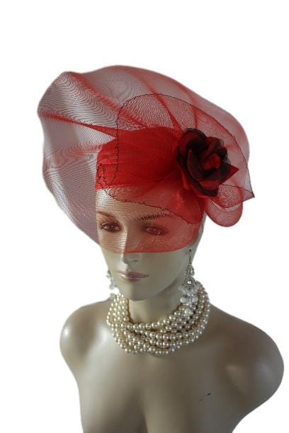 Red Pillbox Haute Couture Cocktail Hat Fascinator For Women With A Large Red Sheer Crinoline Bow And Red And Burgundy Open Silk Rose. This Hand Made 1920’s Flapper Era Designer Headpiece Will Impress. This Stylish Lightweight Fascinator Pillbox Style Hat Is Embellished With A Hat Pin To Hold This Wedding Fascinator In Place.