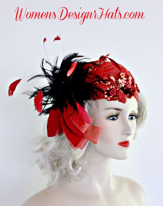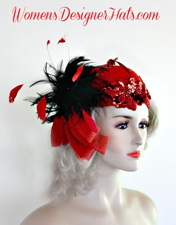 Red Sequin Beaded Pillbox Cocktail Hat For Women With Black And Red Feathers. Hand Made 1920’s Flapper Era Designer Fashion Hat. Trimmed With A Large Red Crinoline Horse Hair Bow, Accented With Expensive Black Feathers. Art Deco Red Sequin Beaded Glass Appliques Are Placed On This Headpiece. Delicate Shooting Red Feathers Are Placed Throughout The Black Feathers. This Headpiece Comes With A Hat Pin To Hold This Wedding Fascinator In Place.