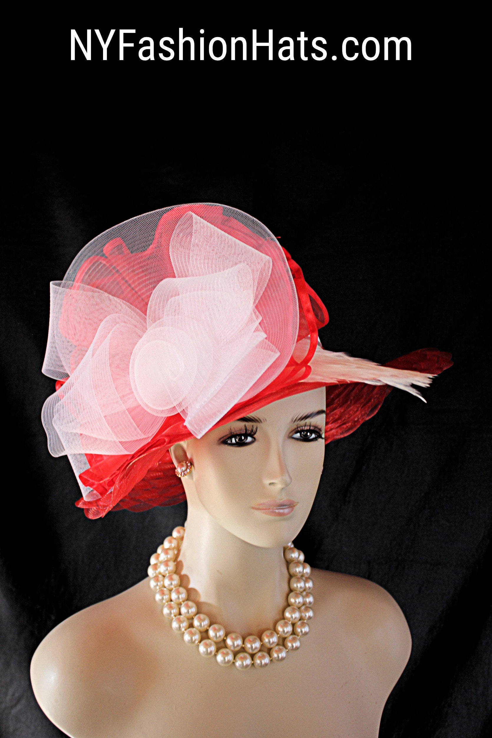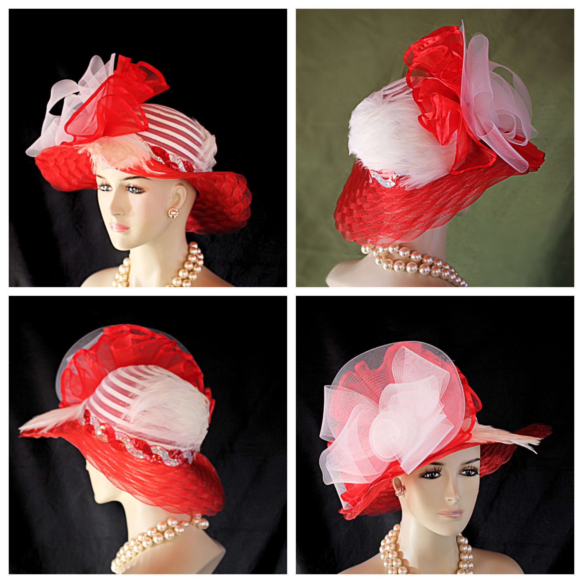 Haute Couture Red And White Designer Fashion Hat For The Kentucky Derby Formals Weddings And Special Occasion. This Custom Designed Women’s Dress Hat Is Trimmed With A Large Sheer White Horsehair Crinoline Rosette Bow Mixed With A Red Large Organza Bow Embellished With A Red Satin Edge. White Rooster Hackle Feathers Are Placed Along The Brim And Crown Of This Gorgeous Hat. The Crown Of This Elegant Hat Is A White Horsehair Mixed With A Poly Braid. The Brim Is Made Of A Scalloped Design Than Runs Throughout The Brim.