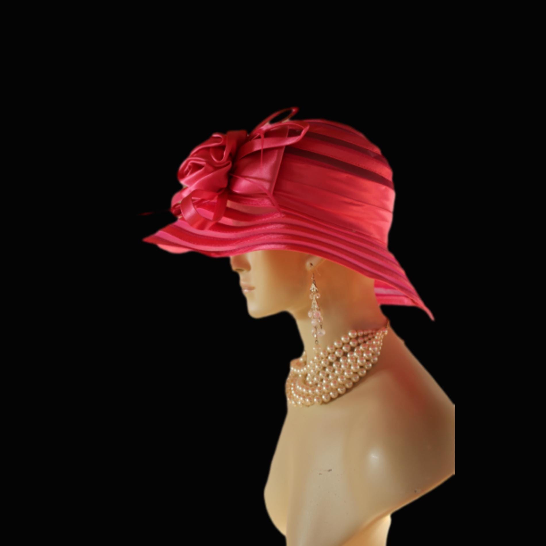 This Stylish Church Or Sabbath Hat Is Embellished With A Large Hot Pink Decorative Satin Bow Enhanced With Satin Loop Bowing To Match The Hat. Delicate Goose Biot Feathers Are Placed Within The Bowing For Added Elegance. A Simple Satin Trim Encircles The Crown Of This Fashion Wedding Headpiece. This Formal 1920’s Flapper Art Deco Styled Hat Wedding Headpiece Can Be Worn In Different Positions. The Large Rosette Bow Can Be Worn Toward The Face, Side Of The Head Or In The Back. The brim of this hat can also be adjusted a bit if you would like it turned up.