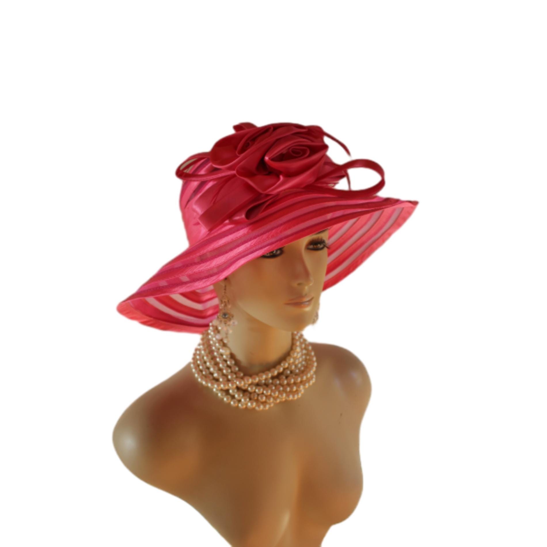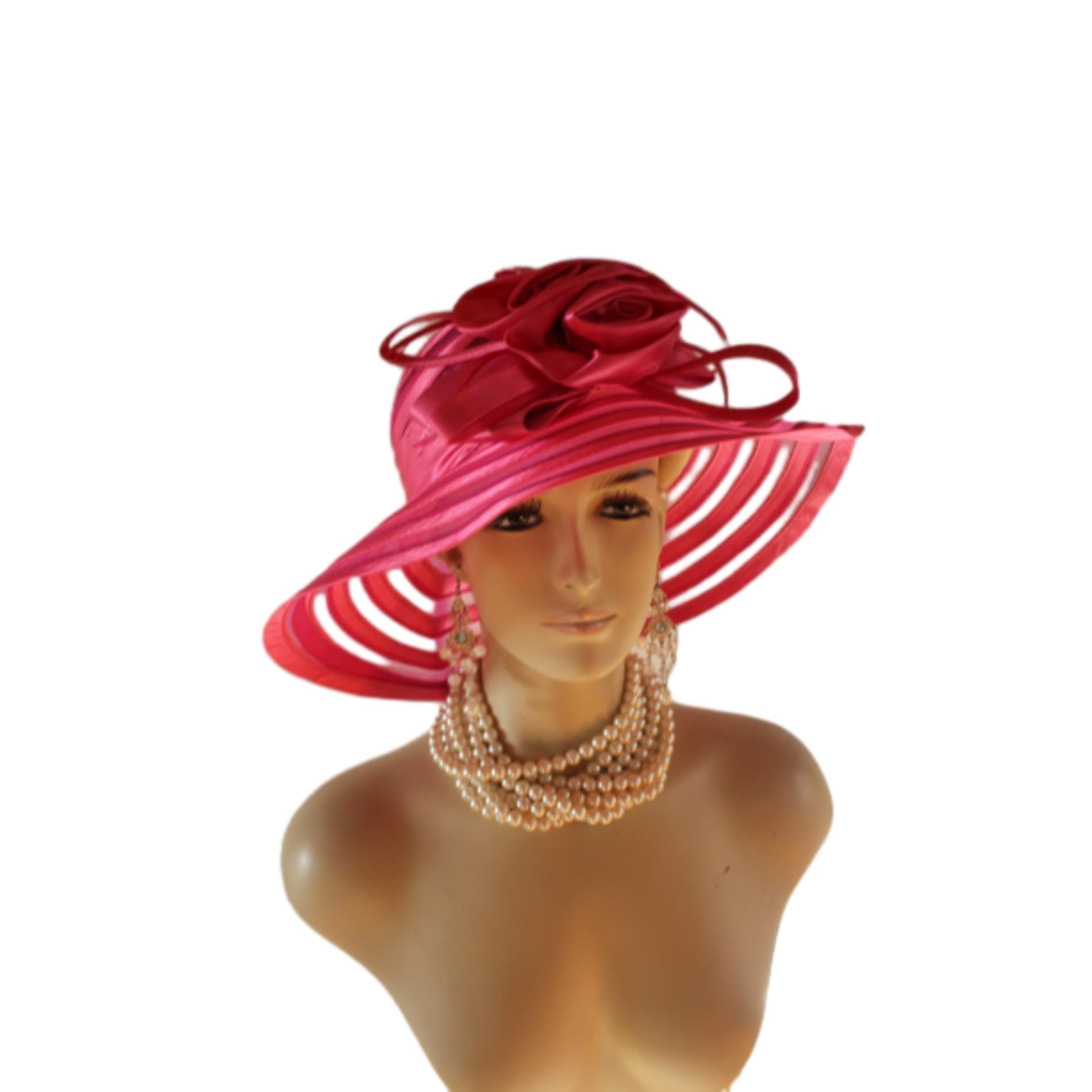 Women’s Formal Haute Couture Hot Pink Satin Floppy Satin Crinoline Wide Brim Kentucky Derby Dress Hat.