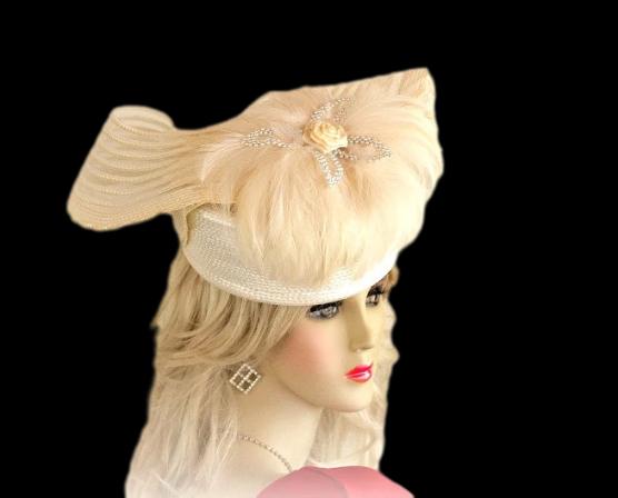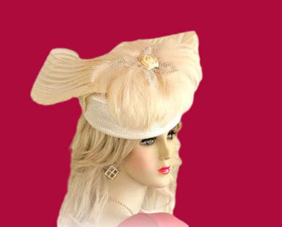 Ladies Women’s Ivory And Beige Designer Special Occasion Pillbox Wedding Bridal Hat. This Classic Hat, Is Suited For Church, Synagogue, Weddings, Formals, And Parties. By www.NYFashionHats.ComNYFashionHats Haute Couture Millinery Headwear For Women