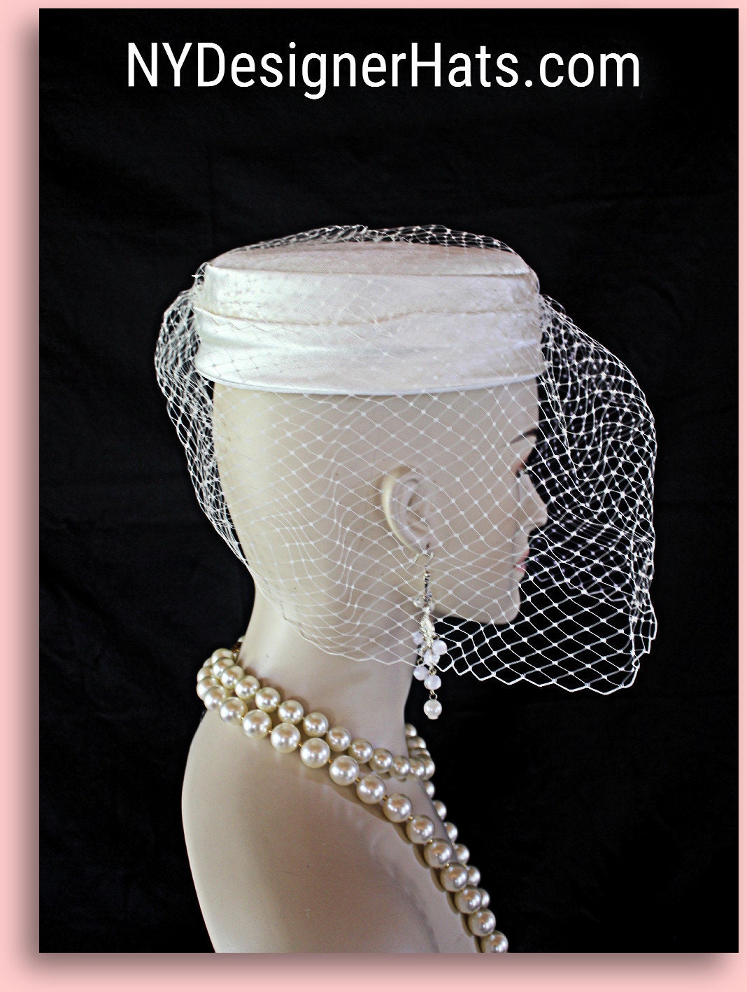 Classic Styled Shaped Crown,NY Fashion Hats Millinery Headwear Apparel,Ivory Or Soft Beige Satin Pillbox Hat,Birdcage Netting Russian Veiling,Simple In Design But Oh So Classic,Hats For Wedding Brides And Guests,CoutureDesignerHats Headpiece