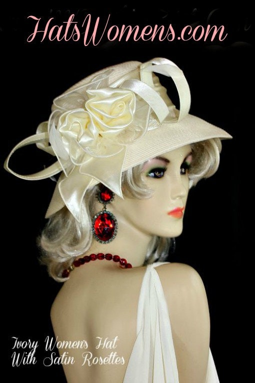 Women’s Soft Ivory Beige Fashion Designer Wide Brim Couture Dress Braid And Satin Wedding Bridal Hat. This Formal Hat Is Trimmed With A Satin Hat Band And Satin Bowing With Satin Rosettes. This Dress Hat Is Also Available In Solid Black.