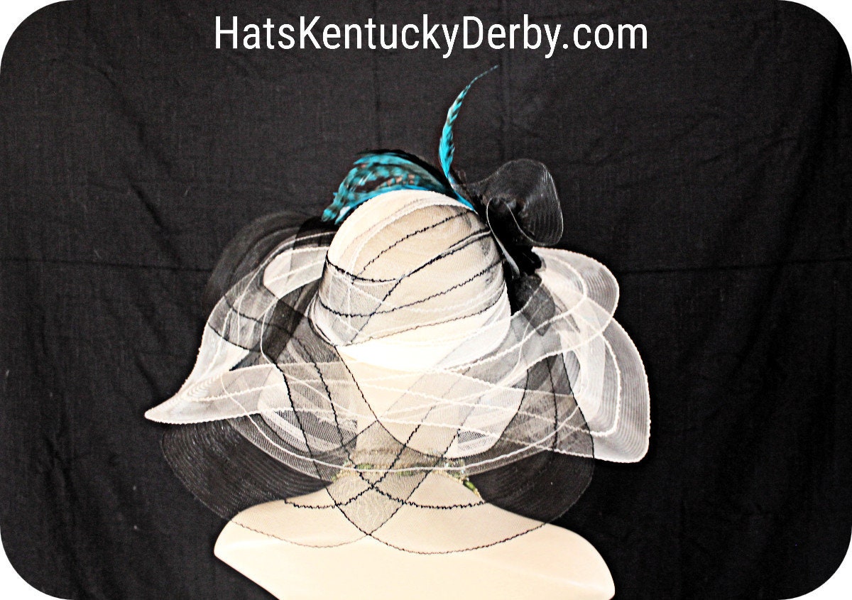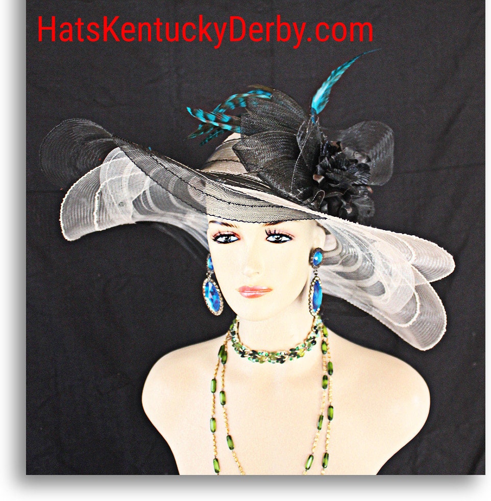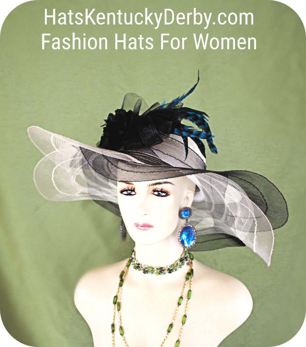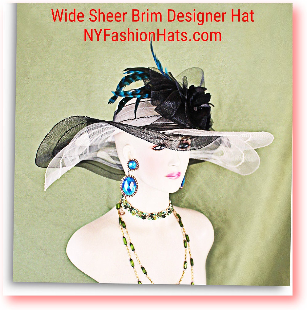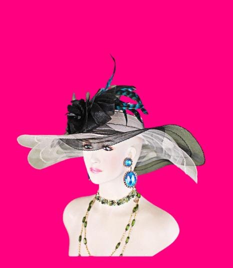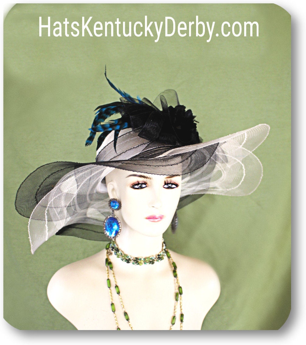 Women’s Haute Couture Cream Ivory And Black Scalloped Edge Wide Brim Designer Bridal Hat For Special Occasion Weddings And The Kentucky Derby. This beautiful fashion hat for women is adorned with a large black horsehair netting bowing enhanced with beautiful handmade velvet vintage flowers. Delicate blue striped rooster hackle feathers give this designer hat a high-fashion look. This is a custom made hat designed and made by HatsKentuckyDerby.com a division of NY Fashion Hats Couture Millinery Headwear Apparel For Women. This Is A Glamorous Hat That Will Make A Huge Hit.