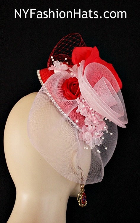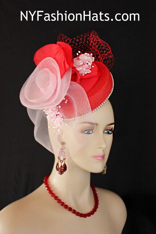 Red And Pink Haute Couture Wedding Fascinator,Cocktail Hats For Occasion And Horse Races,Formal Wedding Bridal Sabbath Church Hat,NYFashionHats Haute Couture Millinery,Each Hat Is Custom Made Per Order,Pink Large Rosette Horsehair Bow,Red Birdcage Netting Bow,Red And Pink Silk Flower,Rhinestones