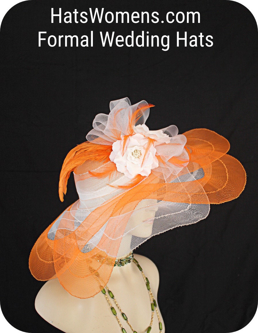 Women’s Haute Couture White And Orange Scalloped Edge Wide Brim Designer Bridal Hat For Special Occasion Weddings And The Kentucky Derby. This beautiful fashion hat for brides is adorned with a large white horsehair netting bowing enhanced with a two beautiful handmade white silk vintage roses. Delicate orange rooster hackle feathers are placed within the white roses. Adorned on the side of the bow are long orange rooster coque feathers. This is a custom made hat designed and made by HatsKentuckyDerby.com a division of NY Fashion Hats Couture Millinery Headwear Apparel For Women. This Is A Glamorous Hat That Will Make A Huge Hit.
