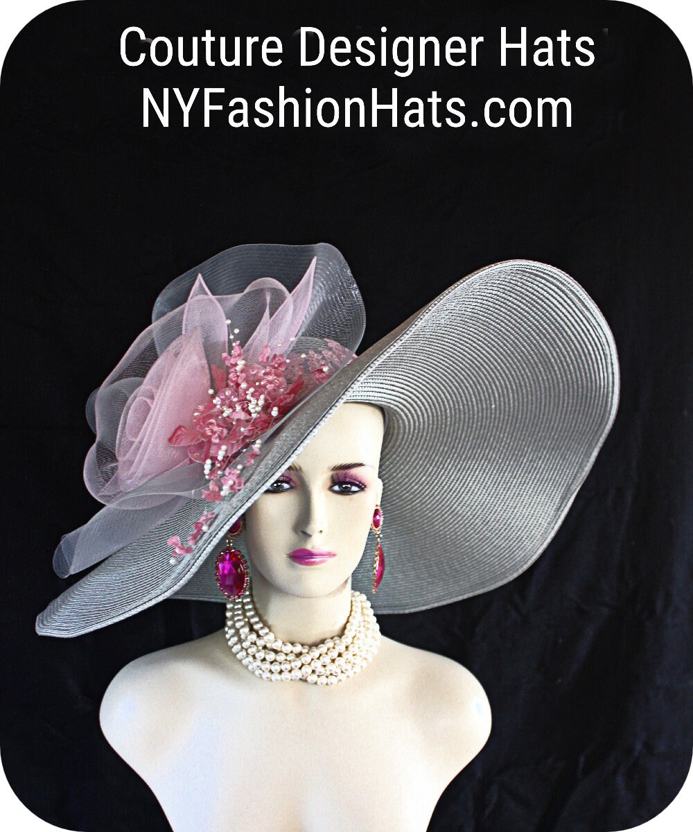 Women’s Silver Grey And Dusty Pink Big Wide Brim Kentucky Derby Hat By NY Fashion Hats Couture Statement Millinery.