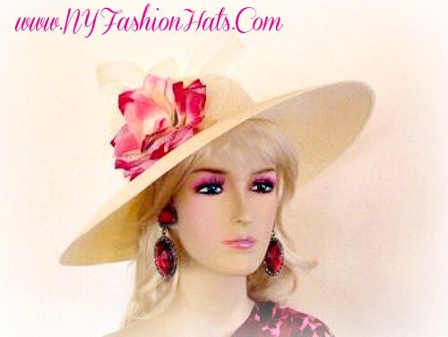 Ivory Or Soft Beige Wide Brim Formal Kentucky Derby Hat For Women Embellished With A Colorful Multi Pink And Ivory Flower. This Couture Fashion Hat Is Suited For The Kentucky Derby, Horse Racing Events, Weddings, Church And Special Occasion. This Dress Hat Is Custom Made And Designed By NY Fashion Hats, nyfashionhats.com