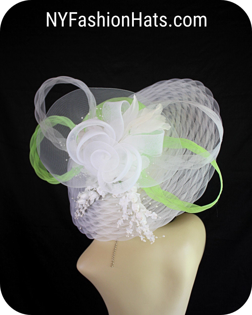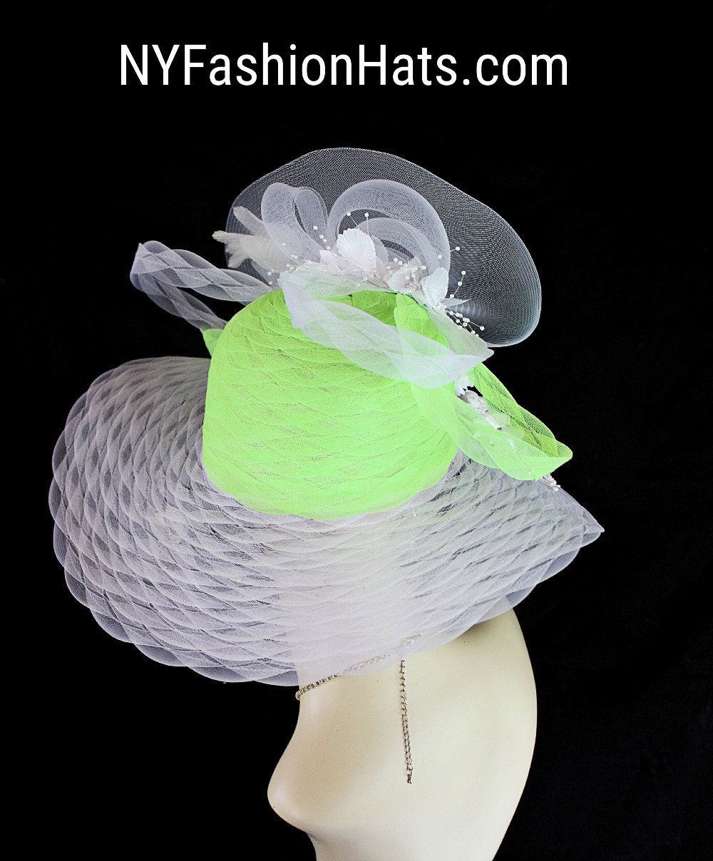 Custom Made Hat Couture Millinery,NYFashionHats Millinery Headwear Apparel,CoutureDesignerHats For Women,Each Hat Is Made Per Order For You,Wedding Bridal Church Dress Hat,White And Lime Green Statement Big Brim Hat,Vintage Silk Rosebud Millinery Flowers,Pearl Stamens With Shooting White Pearls,White Horsehair Crinoline Bow,Sculptured Horsehair Braid Scallop Big Loops,White Brim With Apple Lime Green Crown,Hat Can Be Worn In Different Postions,Delicate White Feathers