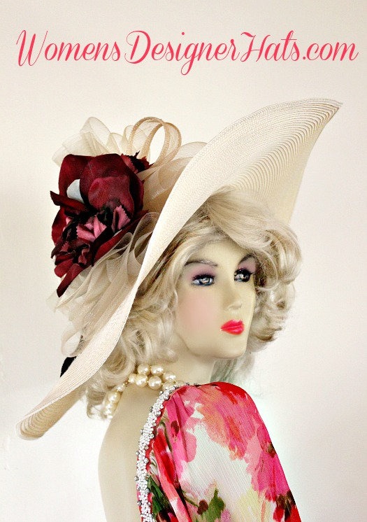 Ivory And Burgundy Wide Brim Haute Couture Designer Kentucky Derby Fashion Hat For Women. This Designer Dress Hat Is Trimmed With A Sheer Crinoline Netting Ivory Bow, Mixed With An Ivory Sinamay Straw Bow, Enhanced With A Custom Dyed Ivory And Silk Millinery Flowers. Delicate Burgundy Feathers Are Placed Behind The Flower For Added Design. This Versatile Hat Can Be Worn In Different Positions. This Feminine Hat Has Such A Romantic Feel. This Exquisite Southern Belle Hat, Is Custom Made And Designed By WomensDesignerHats.com. We Specialize In Formal Hats For Women, Custom Hats For Women, High Fashion Hats, Haute Couture Hats, Wedding Hats, Kentucky Derby Hat, Ladies Dress Hats, Church Hats, And Special Occasion Hats.