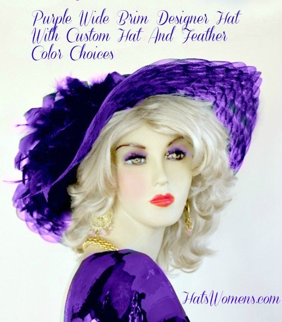 Ladies Purple Scalloped Edge Wide Brim Designer Wedding Church Kentucky Derby Hat With Purple Feathers. Customize This Fashion Hat By Choosing Your Choice Of Hat And Feather Colors. Hat Colors Include: purple wide brim hat, dark brown wide brim hat, pink wide brim hat, white wide brim hat, red wide brim hat, burgundy wide brim hats, black wide brim hat, ivory wide brim hat, kelly green wide brim hat, navy blue wide brim hat, turquoise blue wide brim hat, lemon yellow wide brim hat, lime green wide brim hat, and orange wide brim hat. This fashion hat is Suited for the horse races, Church, wedding, formals and special occasion.