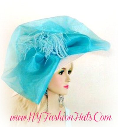 Women’s White Wide Brim Haute Couture Special Occasion Kentucky Derby Hat, With A Large Turquoise Blue Organza Bow, And Turquoise Blue Ostrich Feathers. A White Ostrich Feathers, Give This Fashion Hat Such Style. This Dress Hat, Is Suited For Winter, Spring, Summer And Fall. A Perfect Kentucky Derby Hat. This Hat Is Appropriate For Horse Races, Horse Racing, The Preakness, The Belmont Stakes, Santa Anita Park, Gulfstream Park, Church, Formal Events, Cocktail Parties, A Wedding, A Tea Party, And Holidays. We Sell Church Hats, Dress Hats For Women, Designer Hats For Women, Wedding Hats, Formal Hats, Ladies Custom Hats, Kentucky Derby Hats, Belmont Stakes Hats, Preakness Hats, Hats For Horse Racing, Easter Hats, And Special Occasion Hats. Custom Made And Designed By NY Fashion Hats Millinery At www.NYFashionHats.ComNYFashionHats Haute Couture Millinery Headwear For Women