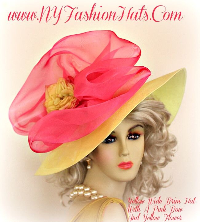 Women’s Yellow Haute Couture Avant Garde Designer Wide Brim Kentucky Derby Horse Racing Hat Embellished With A Hot Pink Organza Bow, And Yellow Flower. This Custom Made Hat, Millinery Accessory, Is Suited To Wear For Horse Racing Events, The Kentucky Derby, Church, Temple, Tea Parties, Spring Charity Events, And Special Occasion. By www.NYFashionHats.Com