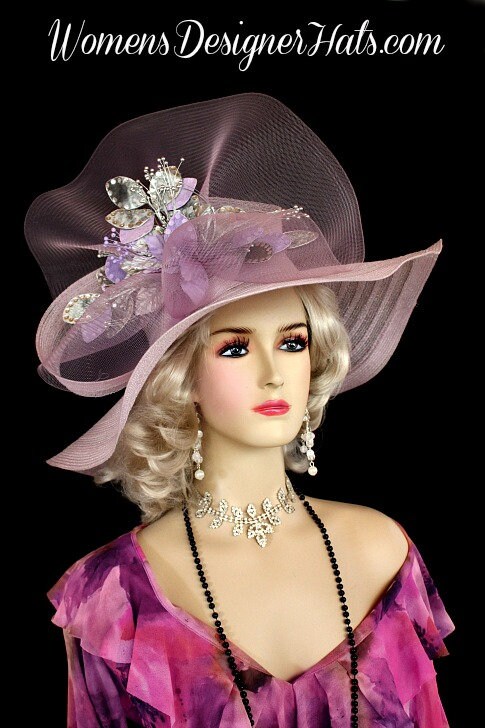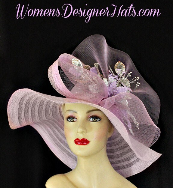Ladies Haute Couture Soft Pastel Lilac Purple Splash Of Grape Lavender Designer Wide Brim Kentucky Derby Hat. This Custom Made Fashion Hat Is Trimmed With A Large Bow Made Of The Same Material Of The Hat And A Large Sheer Pastel Purple Crinoline Bow. Placed Within The Bow Are Hand Dyed And Sprayed Lavender And Metallic Silver Sequin Velvet Millinery Flowers With Silk Leaves.