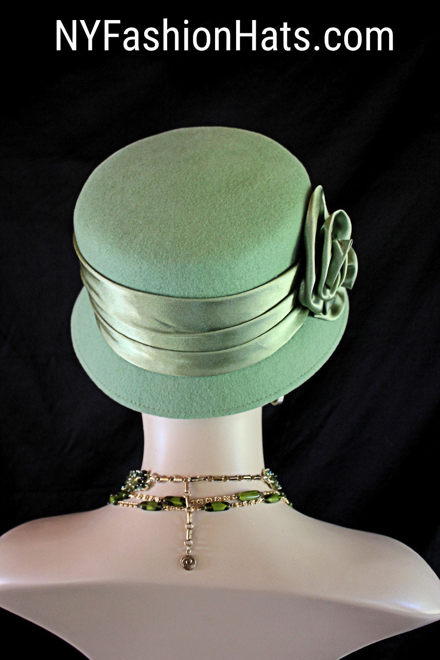 Dusty Lime Sage Green Winter Wool Designer Satin Rosette Bow Women’s Fashion Hat. The Small Brim Tilts Downward On This Classic Styled Dress Hat. A Satin Band Encircles The Crown Of This Simple Yet Very Elegant Dress Hat. This Stylish Wool Hat Can Also Be Work As A Casual Statement Piece.
