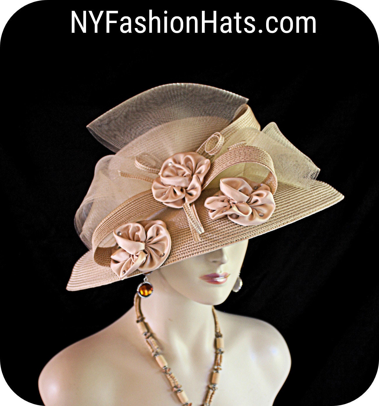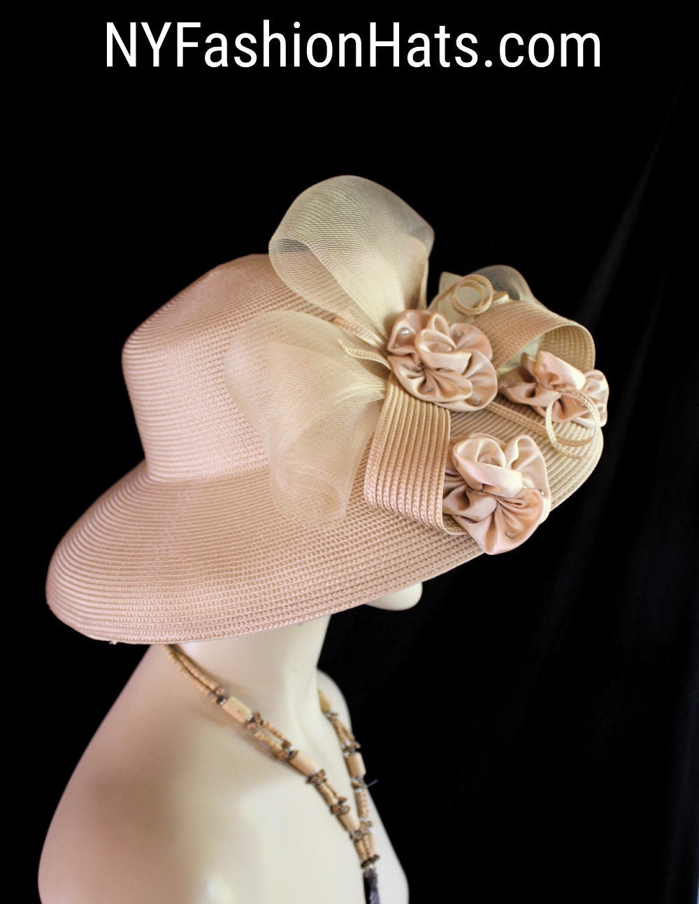 Women’s Haute Couture Camel Beige Wide Big Brim Designer Hat For Special Occasion Weddings And The Kentucky Derby. This fashion hat is adorned with a horsehair crinoline bow accented with a poly braid sculptured shaped. Beige satin rosettes are placed with the bow embedded with rhinestones. This is a custom made hat designed and made by HatsKentuckyDerby.com.