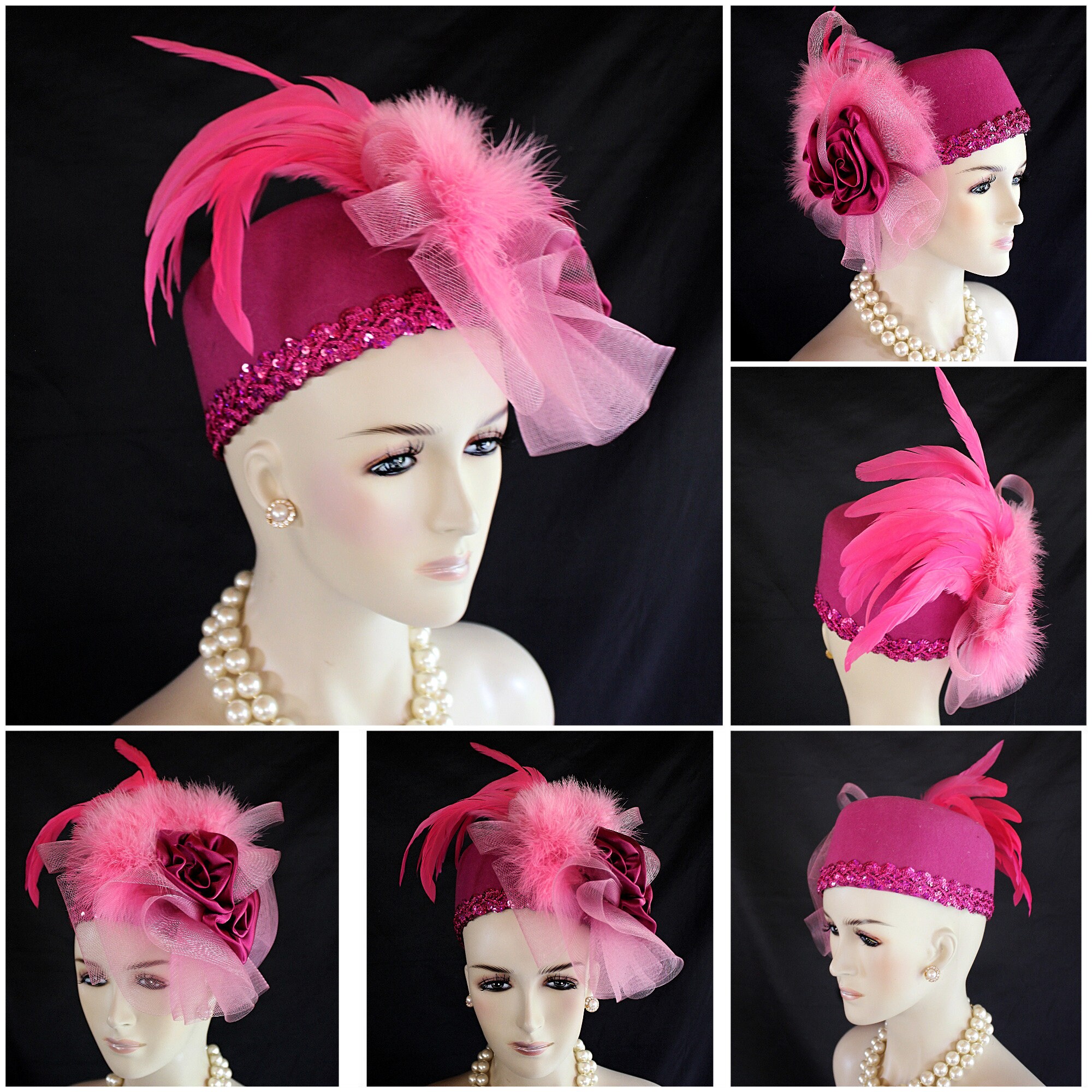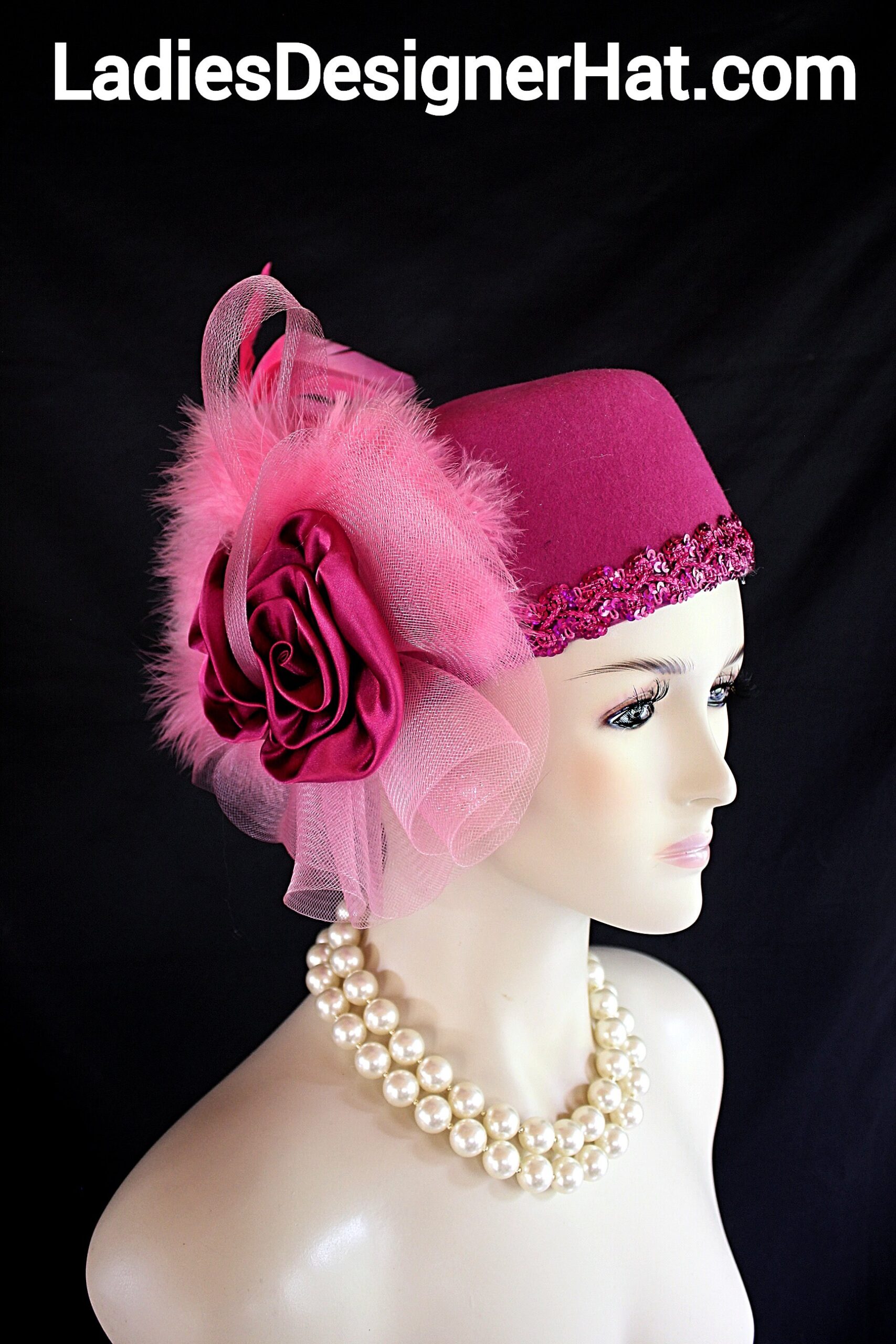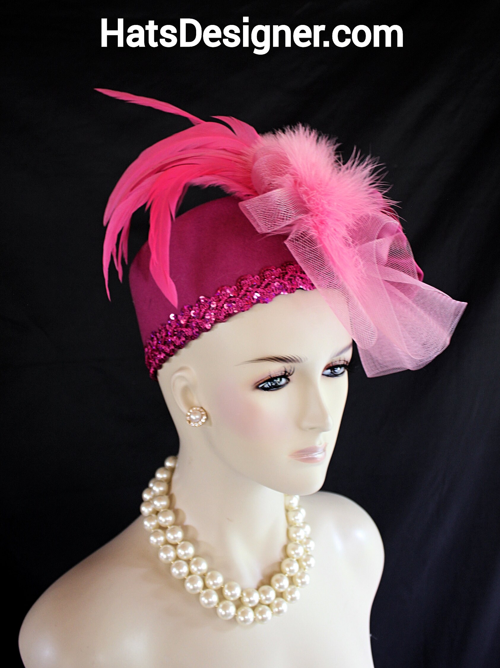 NYFashionHats Couture Hats For Women,Womens Custom Hats,Mother Of The Bride Pillbox Wedding Hat,CoutureDesignerHats Headwear Apparel,Hot Fuchsia Magenta Pink Pillbox Hat,Winter Wool Pillbox Hat,Decorative Sequin Trim,ONE OF A KIND DESIGNER HAT,Handmade Satin Roses,Hot Pink Rooster Coque Feathers,Pink Thick Fluffy Fur Feathers,Soft Pink Pastel Horsehair Crinoline Bow,Magenta Hot Pink Hat