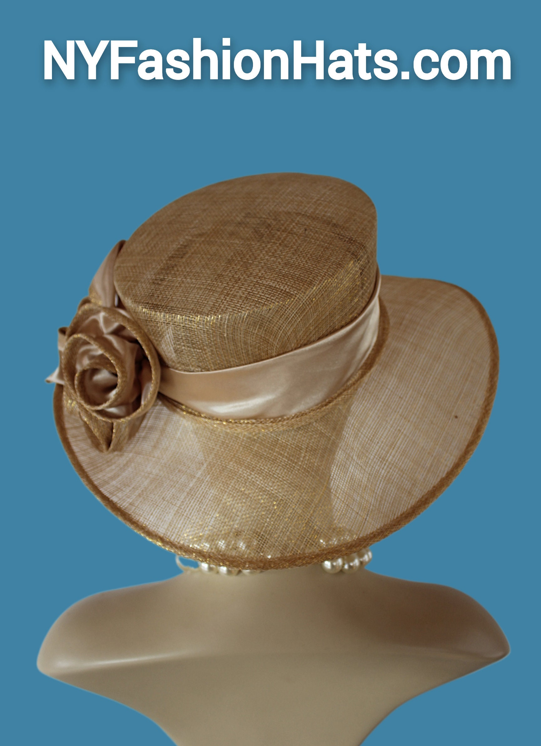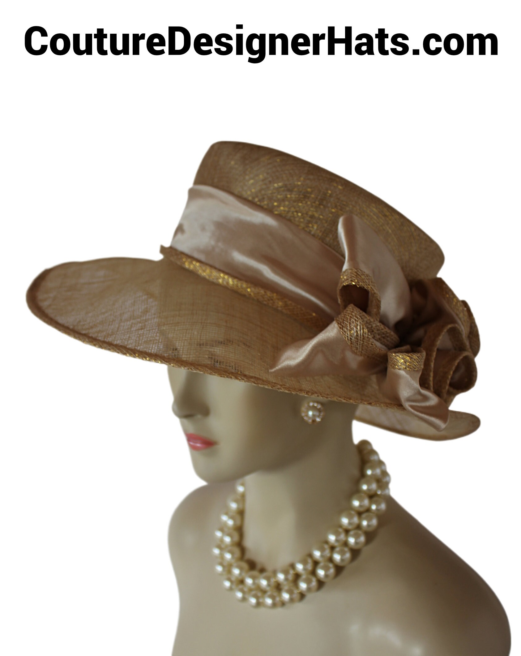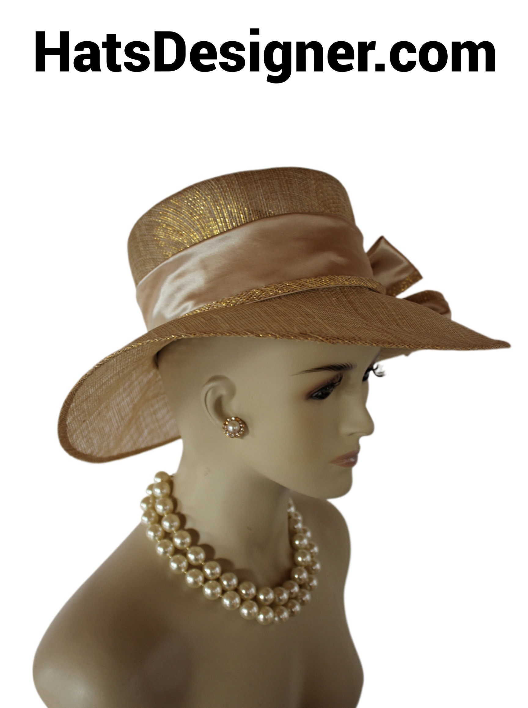 Women’s Formal Haute Couture Big Brim High Crown Metallic Gold And Natural Beige Sinamay Straw And Satin Fashion Hat. This Decorative Wide Printed Brim Kentucky Derby Hat Is Embellished With A Large Sinamay Straw Satin Rosette Bow. A Satin Band Encircles The Crown Of This Pretty Hat. Simpily Feminine And Romantic.