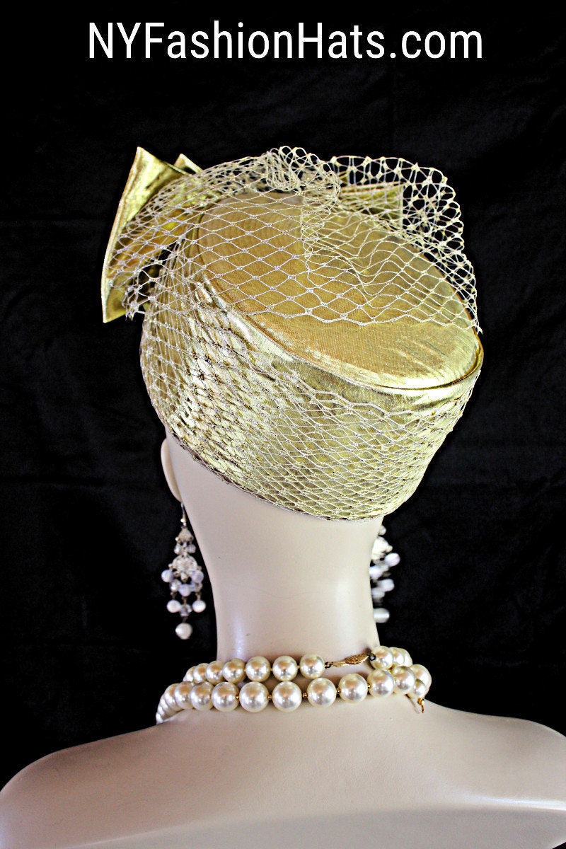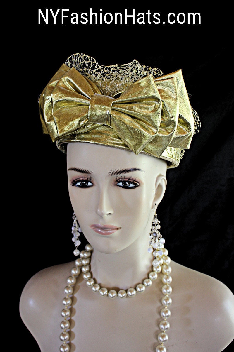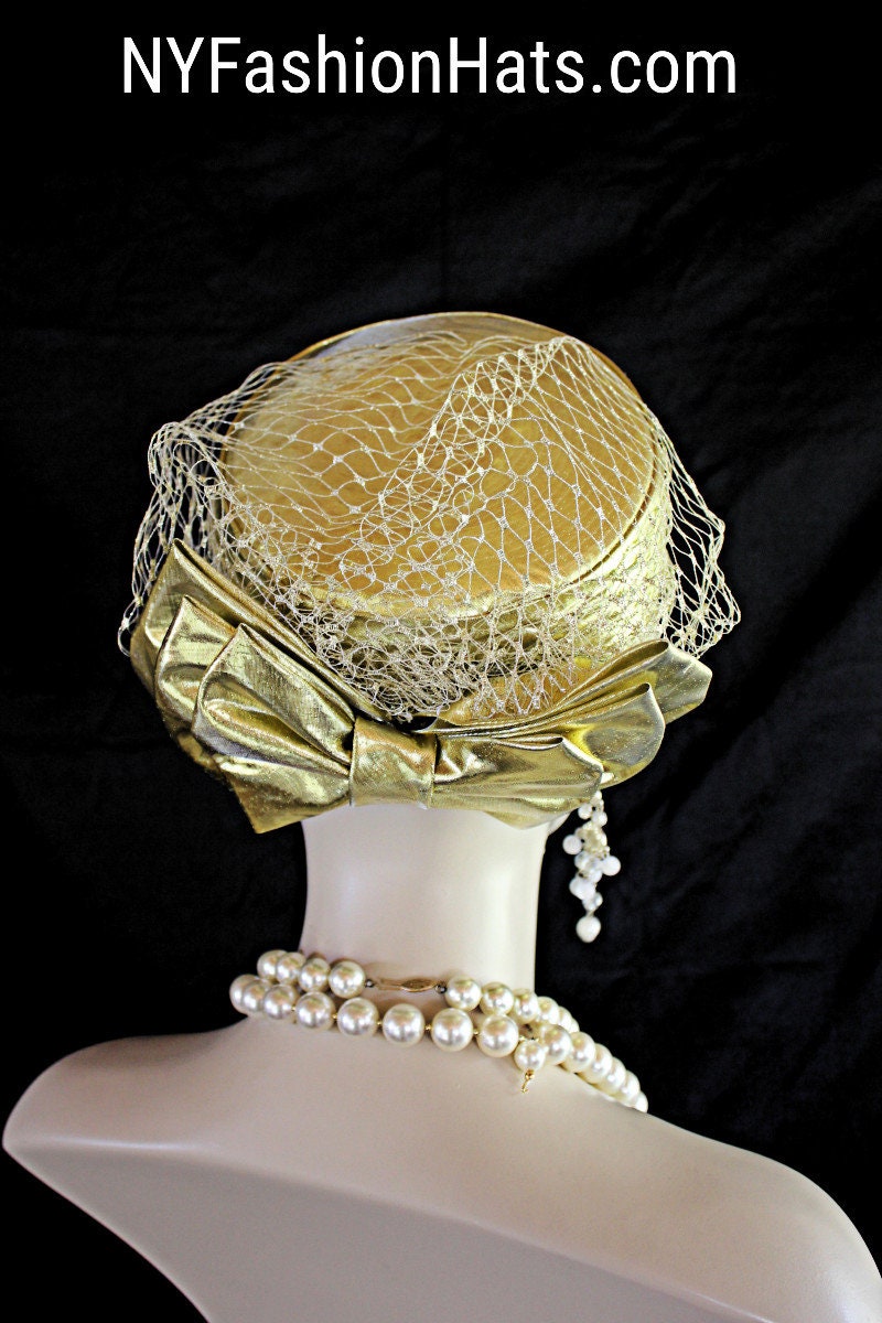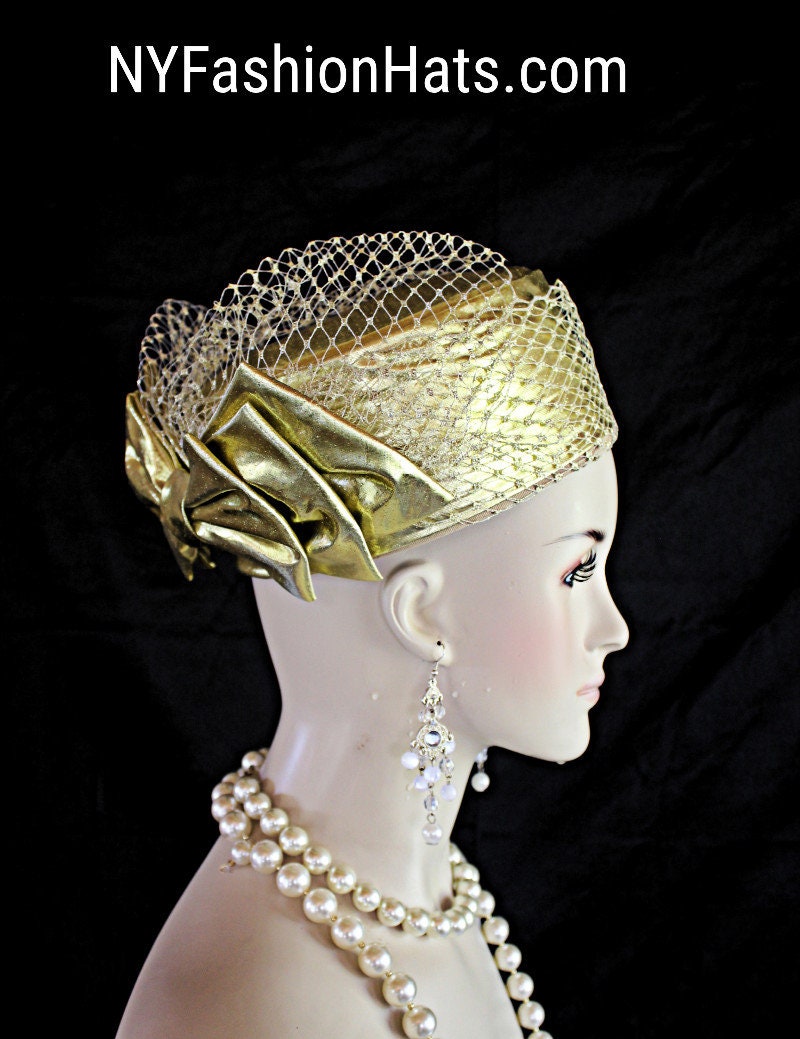 Ladies Metallic Gold Designer Lame Pillbox Bridal Wedding Hat Embellished With A Large Metallic Gold Lame Bow And Birdcage Netting Veil On Top And Side Of Hat. Note: Veil Does Not Cover The Face. The Bow Can Be Worn Toward The Front Of The Face Or Toward The Back Of The Head. A Perfect Hat For A Bride Or Mother Of The Bride Or Groom. This Designer Fashion Church Hat Is Custom Made And Designed By NY Fashion Hats Custom Millinery Headwear. http://www.nyfashionhats.com