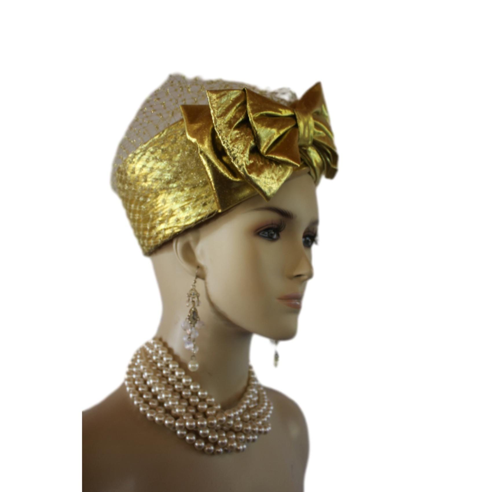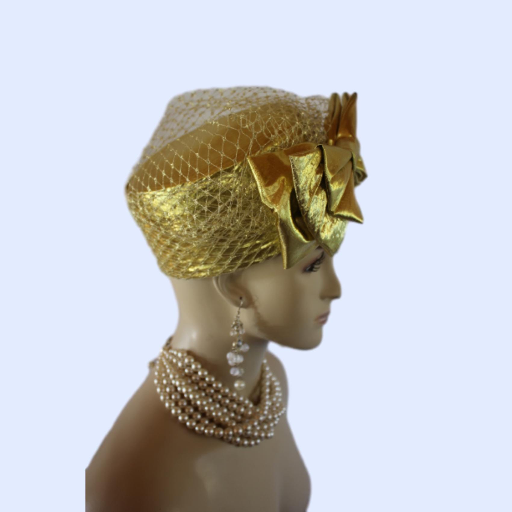 NY Fashion Hats Millinery Headwear Apparel,Square Crown Style Pillbox Hat,Birdcage Netting On Top Of Crown,Some Birdcage Netting On Hat,Metallic Gold Lame Pillbox Wedding Hat,Large Metallic Gold Lame Bow,Couture Designer Bridal Hats For Women,Each Hat Is Custom Made Per Order,Mother Of The Bride Hat Headwear