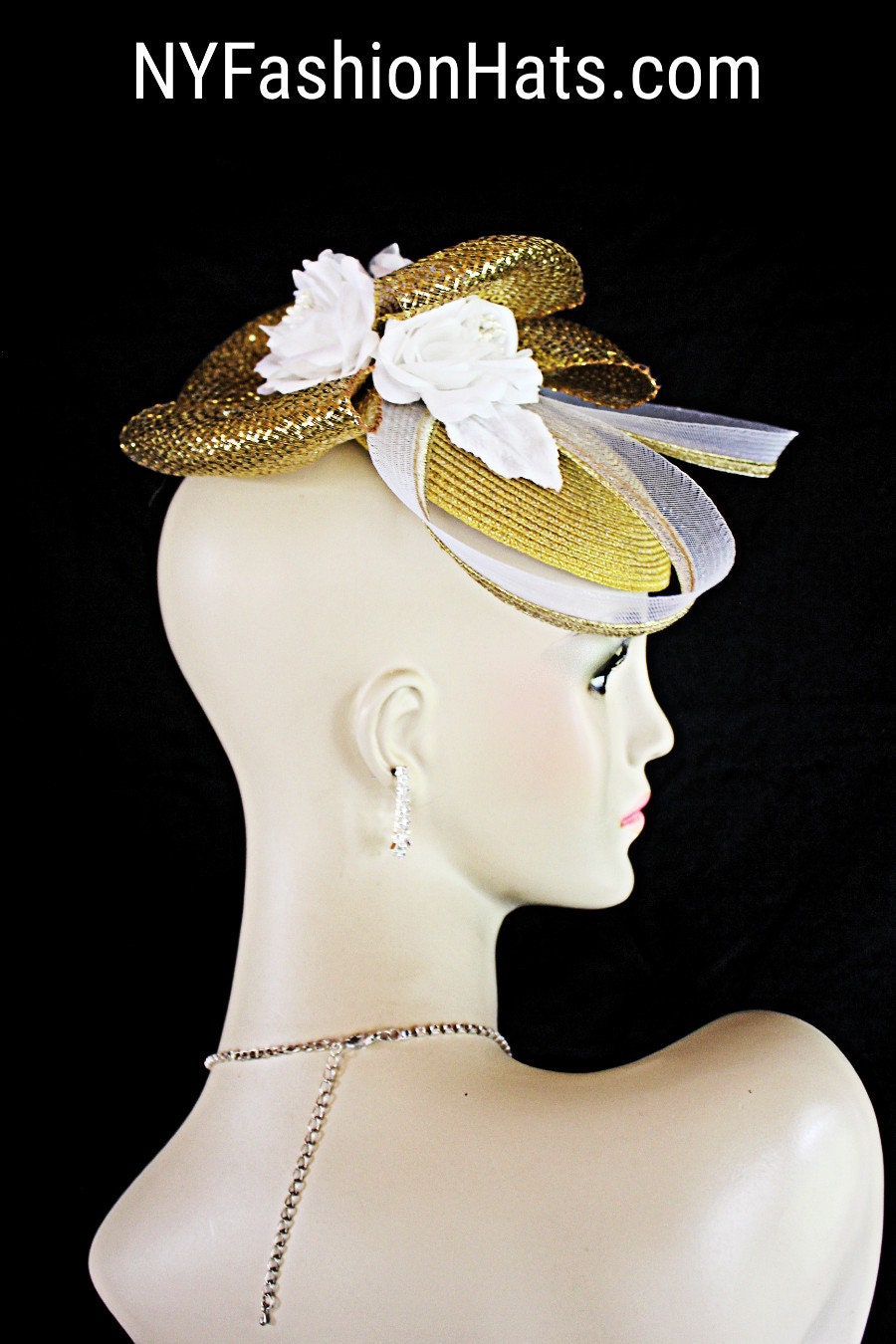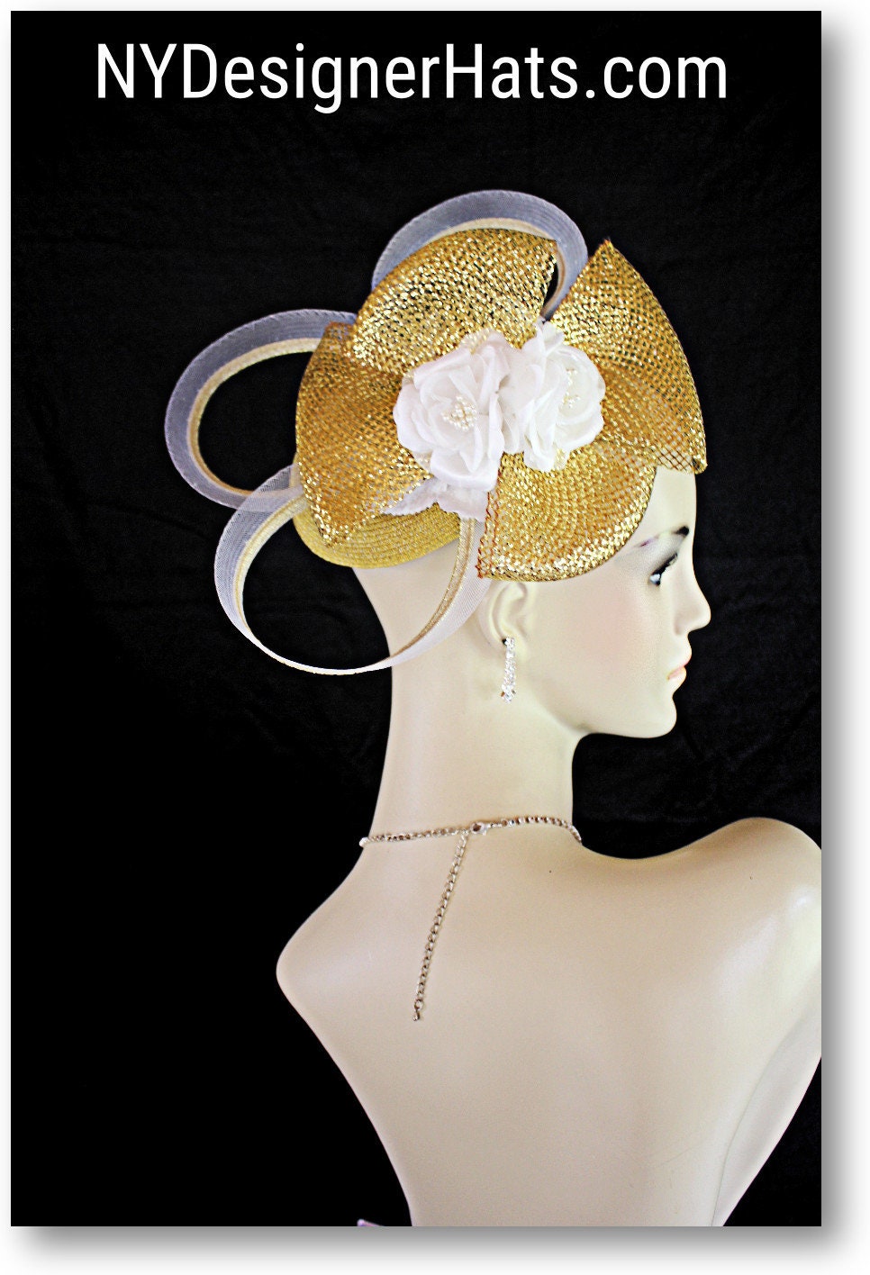 Motf Premium Classic Vintage Styled Ladies Hand Made Metallic Gold And White Wedding Fascinator Designer Hat With A Large Dramatic Bow. This Exclusive Luxury Statement Fashion Hat Is Trimmed With A Custom Made Metallic Gold Horsehair Bow Accented With White Horsehair Loop Bowing Embellished With A Metallic Gold Poly Braid Trim. White Silk Millinery Roses With White Leaves Are Placed Within The Fancy Bowing.