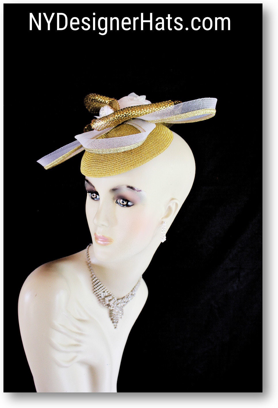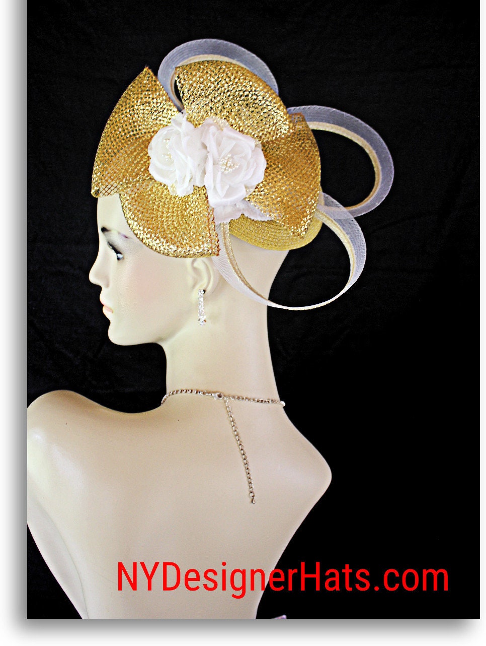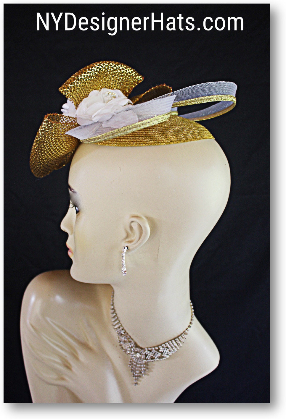 Handmade Couture Designer Hat,Horsehair Braid Bow Trimmed Edge,NYFashionHats Millinery,CoutureDesignerHats,Large Dramatic Horsehair And Braid Bow,Haute Couture Custom Millinery Apparel,Mother Of The Bride Hats Headwear Apparel,Formal Wedding Bridal Occasion Hat,Metallic Gold And White Cocktail Hat,White Silk Millinery Roses,Metallic Gold Horsehair Big Bow,Wedding Bridal Saucer Fascinator Brides,Custom Made Hat Pin