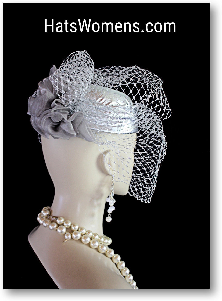 Ladies Hand Made Metallic Silver Lame Pillbox Couture Designer Hat With A Face Veil. This Exclusive Fashion Hat Is Trimmed With A Birdcage Face Netting Veil And A Large Birdcage Netting Veil Bow Enhanced With A Decorative Gray Organza Bow. This Versatile Hat Can Be Worn In Different Positions To Complement Your Facial Structure. The Veil Can Be Worn To Cover The Face Partially Or Toward The Back Of The Head. This Hat Is A Show Stopper And Will Make A Fashion Statement. This Flattering Hat Is Suited For Winter, Spring, Summer Or Fall.