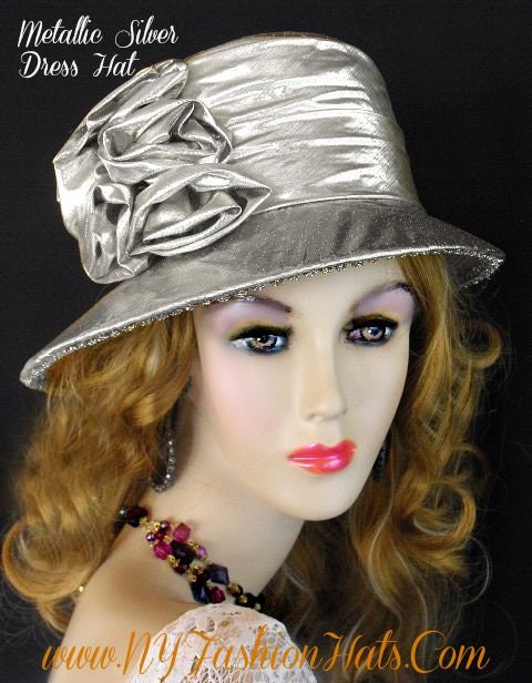 Women’s Couture Designer Metallic Silver Lame Fabric Rosette Abstract Slant Small Brim Fashion Hat. The Small Brim Tilts Downward On This Classic Styled Dress Hat. A Lame Band Encircles The Crown Of This Simple Yet Very Elegant Dress Hat. This Hat Can Also Be Work As A Casual Statement Piece.