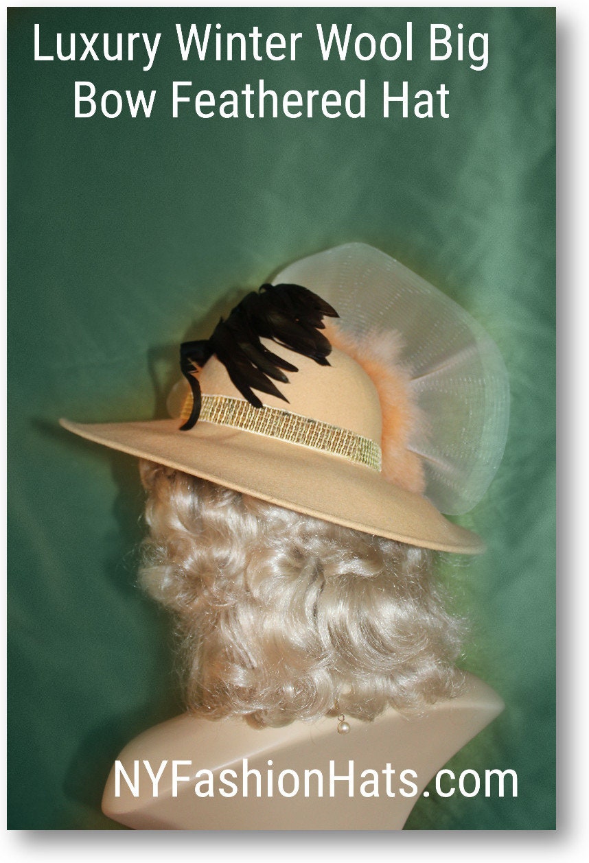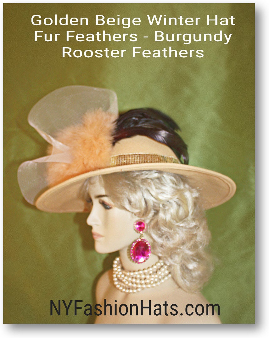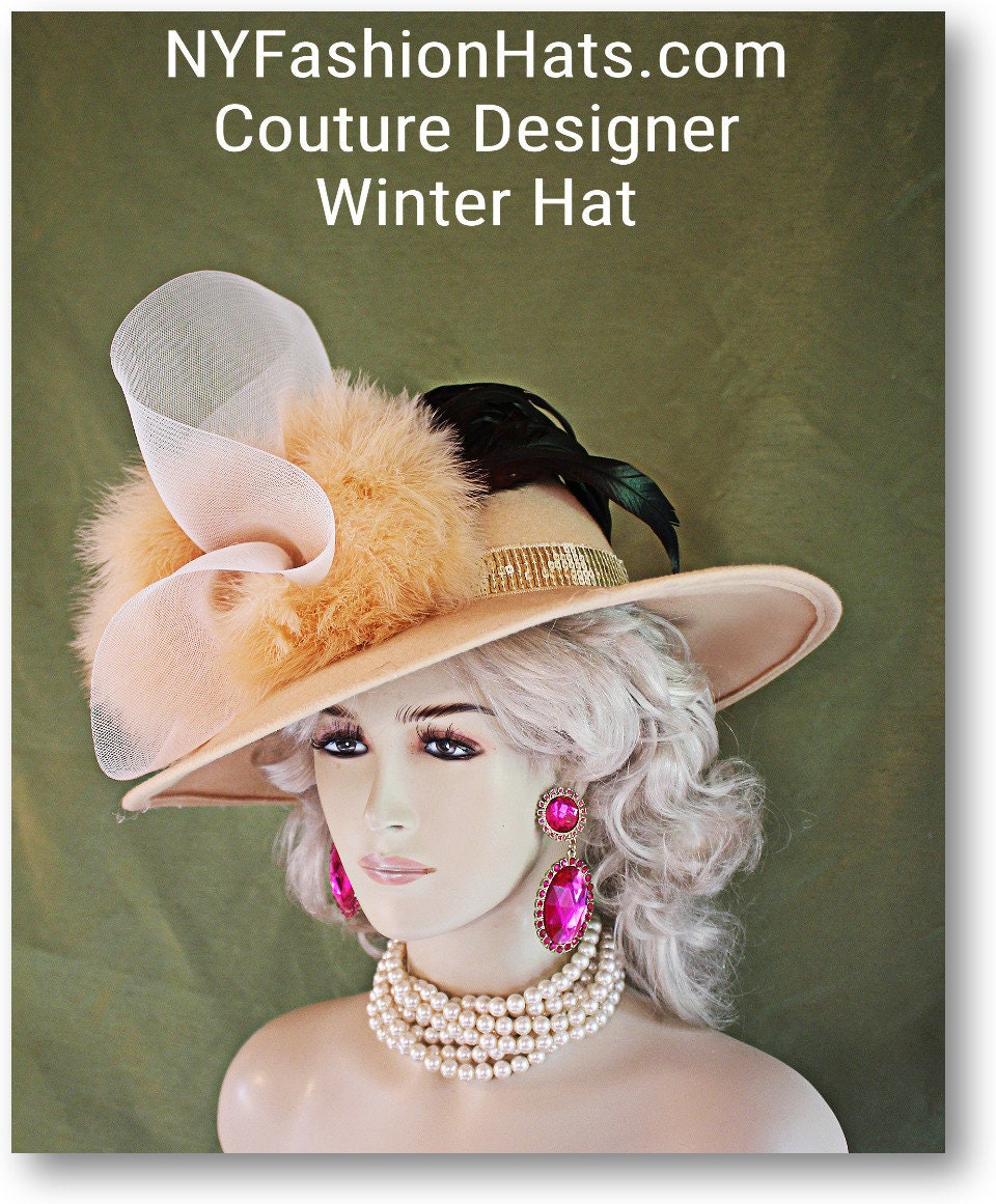Haute Couture Motf Premium Golden Beige Winter Wool Formal Marabou Fur Feathered Designer Statement Hat For Women. This Old Hollywood Vintage Inspired Wool Fall Hat Is Trimmed A Large Crinoline Horsehair Bow Accented With Exotic Marabou Fur Feathers. NOTE: These Feathers Resemble Fox Fur, They Are Very Thick Feathers. An Intricate Metallic Sequin Band Encircles The Crown Of This High-Fashion Hat. For The Final Touch, Long Iridescent Coque Feathers Are Placed Behind The Fur Feathers For A Prestigious Look. This Statement Hat Is A Showpiece. This Is A One Of A Kind Hat.