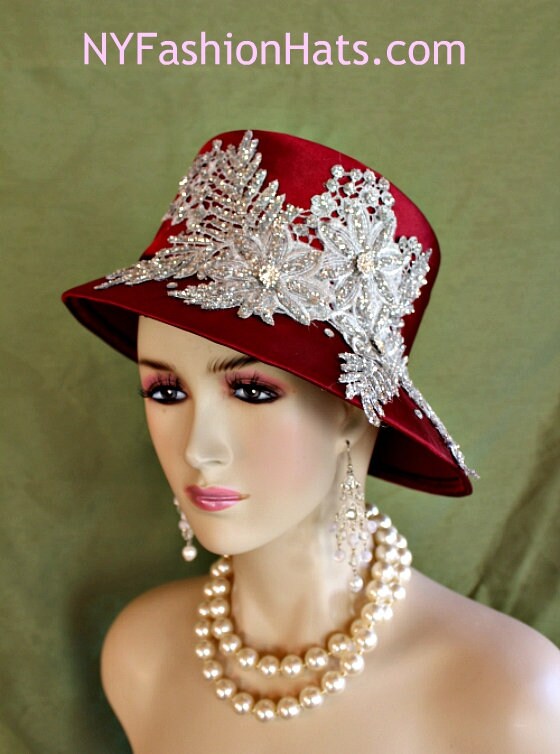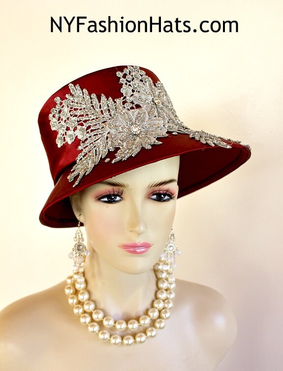 Embroidered Rhinestone Glitter Appliques,Glass Rhinestones,Vintage Style Brim Hat,Floral Fashion Appliques,Hat Pin,Burgundy Wine Satin Hat,Abstract Slant Brim Couture Hat