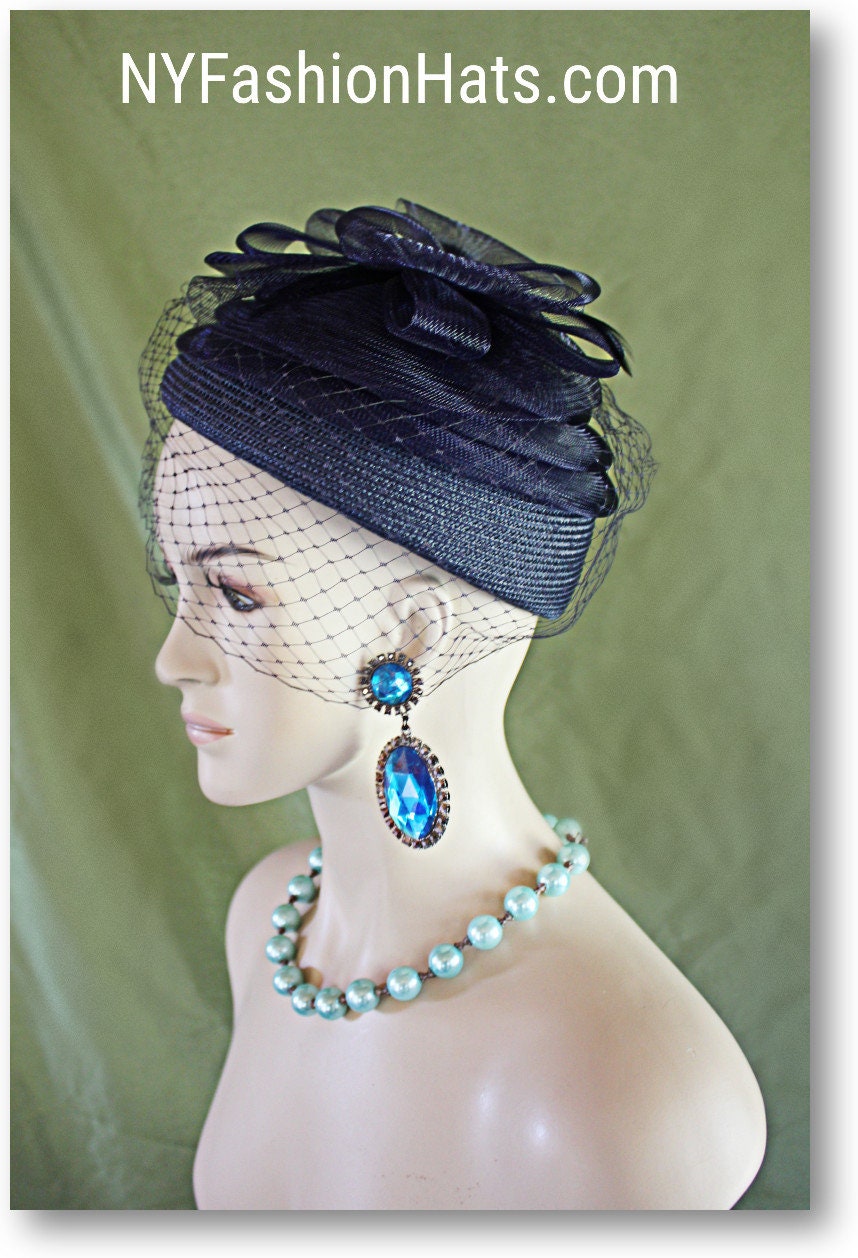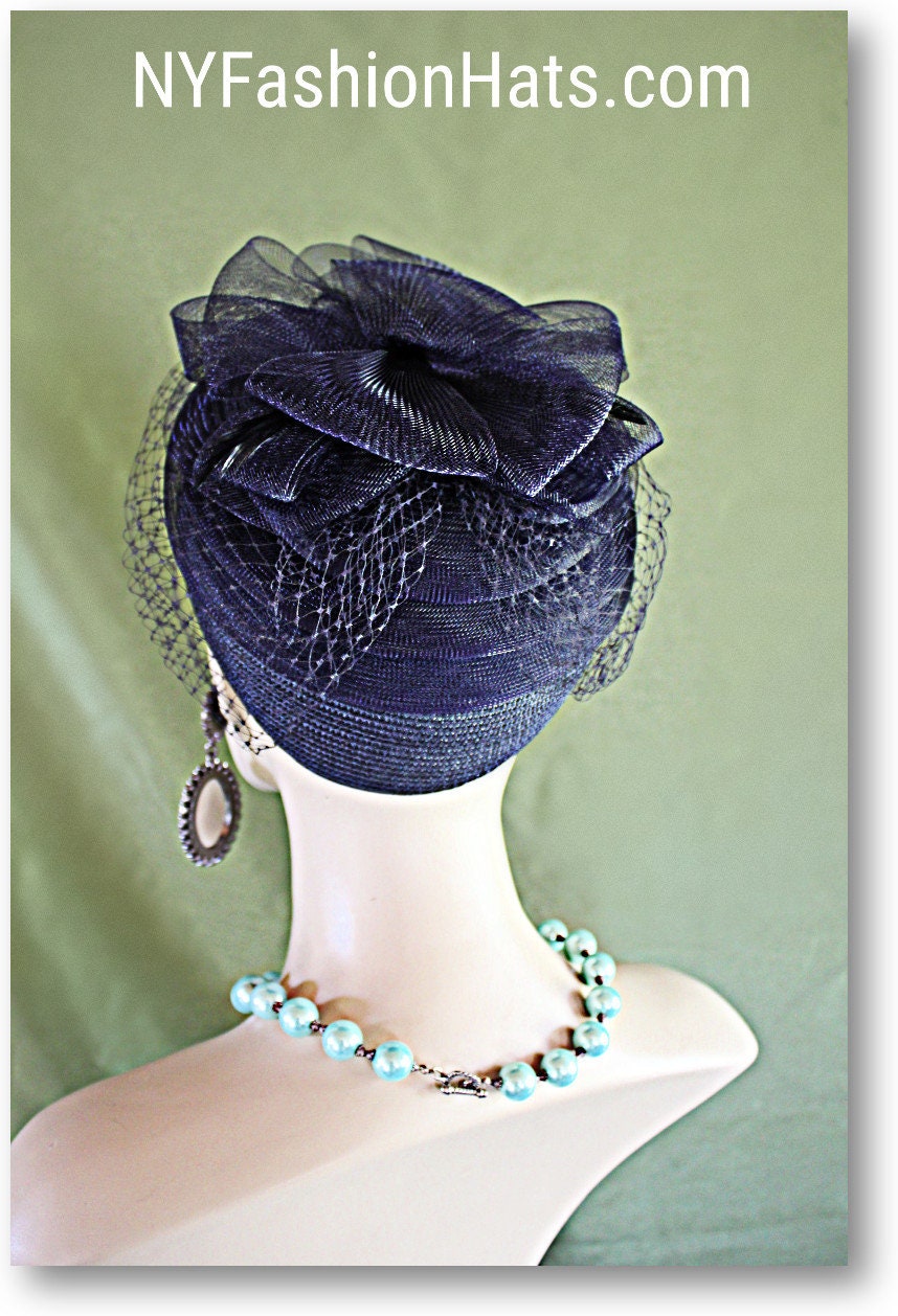 Pillbox Wedding Bridal Hat Birdcage Veil, Mother Of The Bride Hat, Navy Blue Hats Temple Church Formals, Designer Hat, NYFashionHats Couture