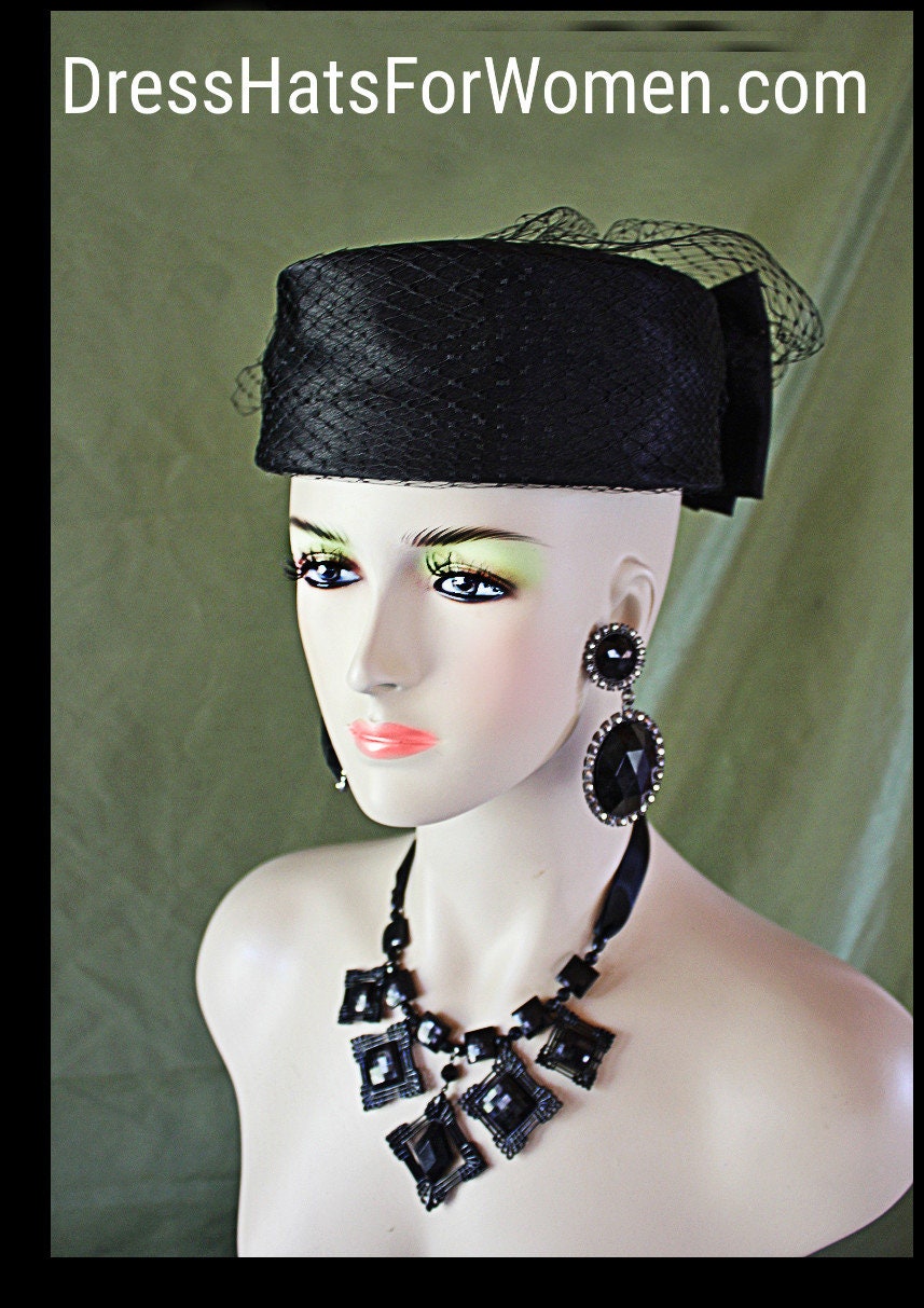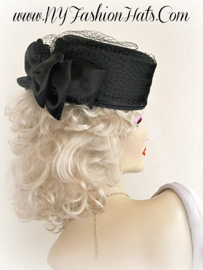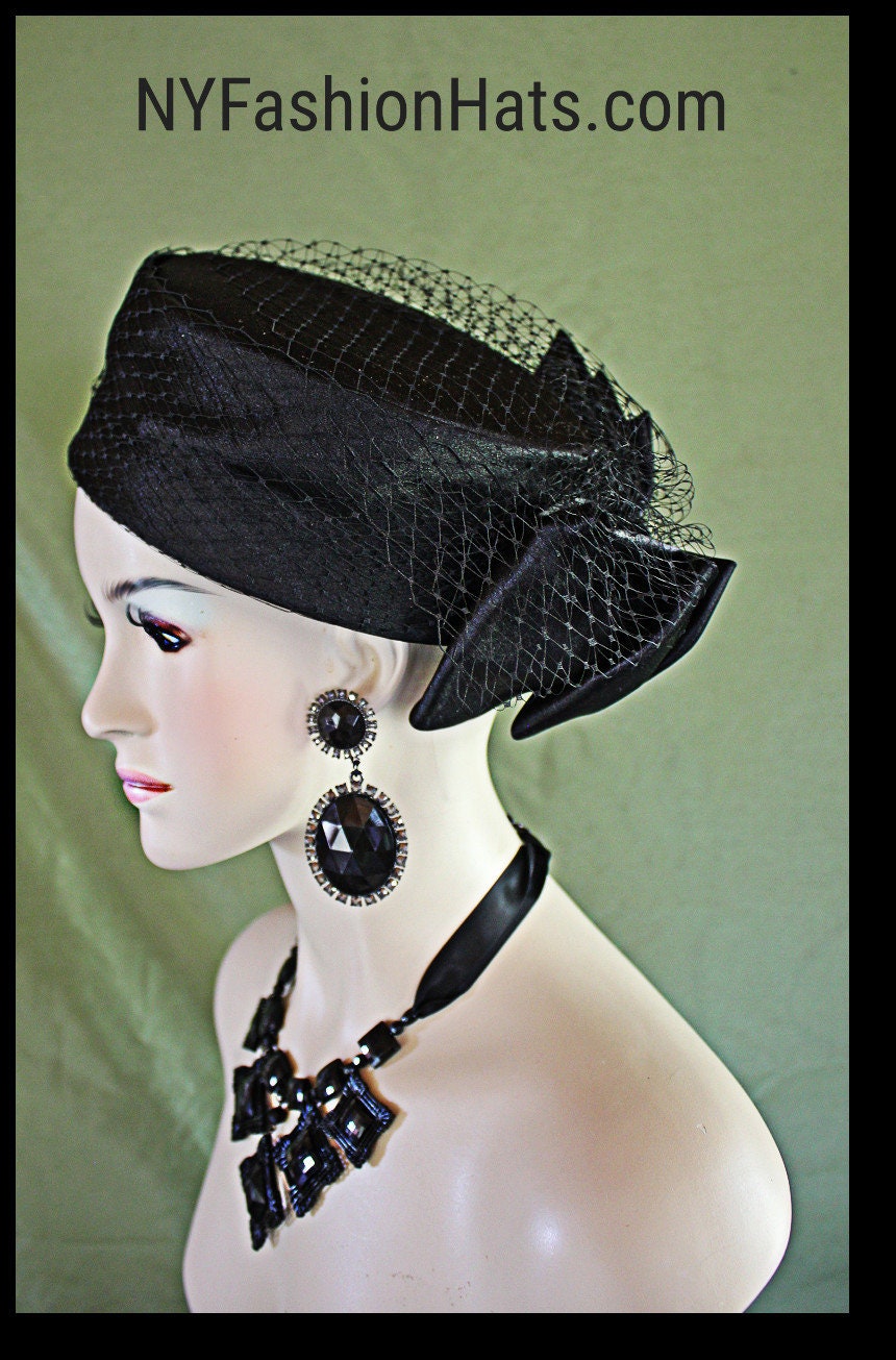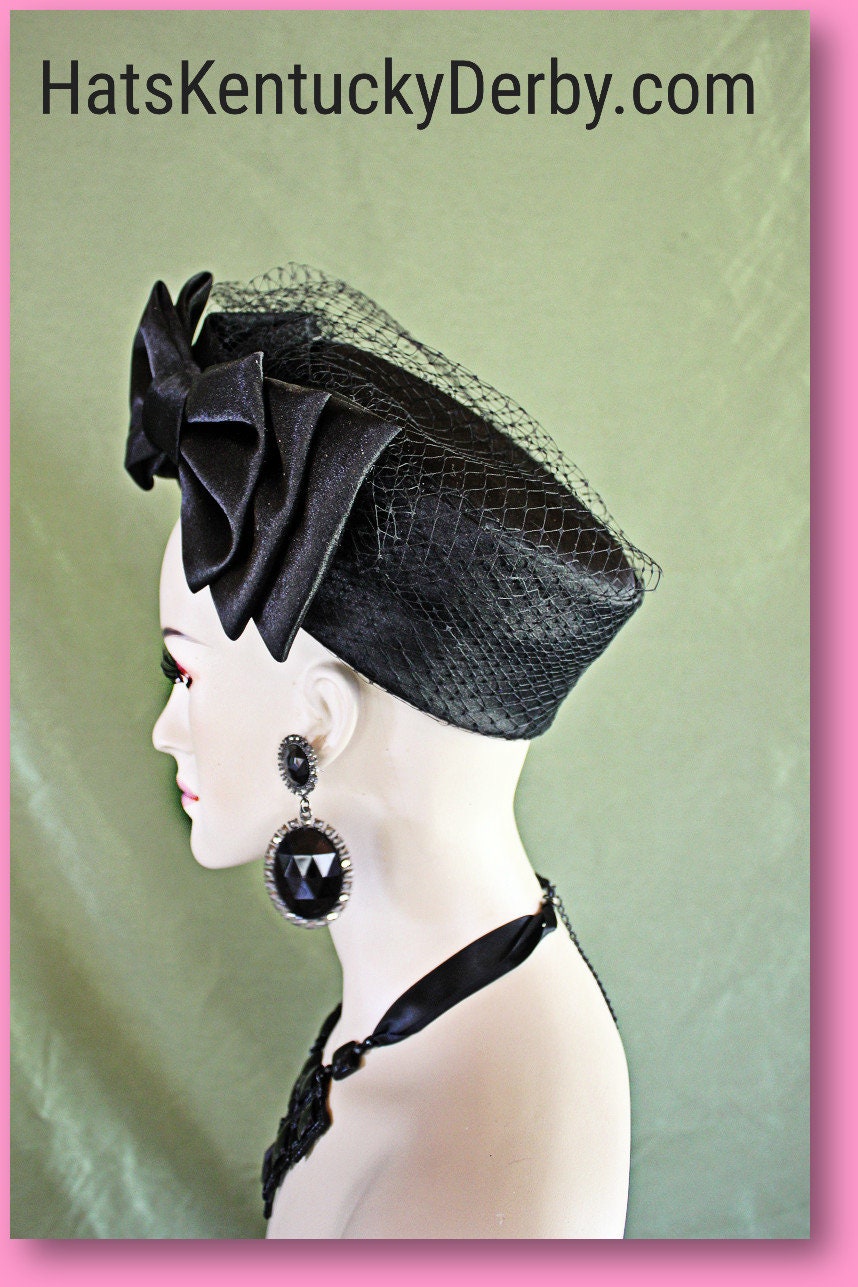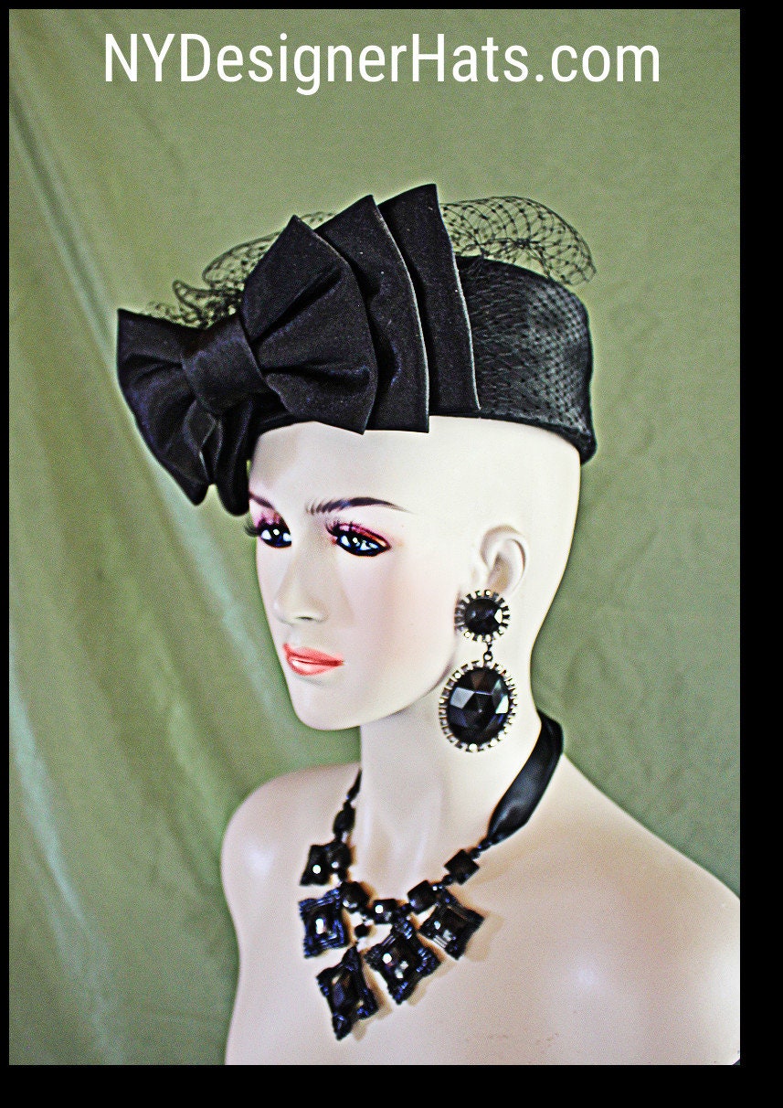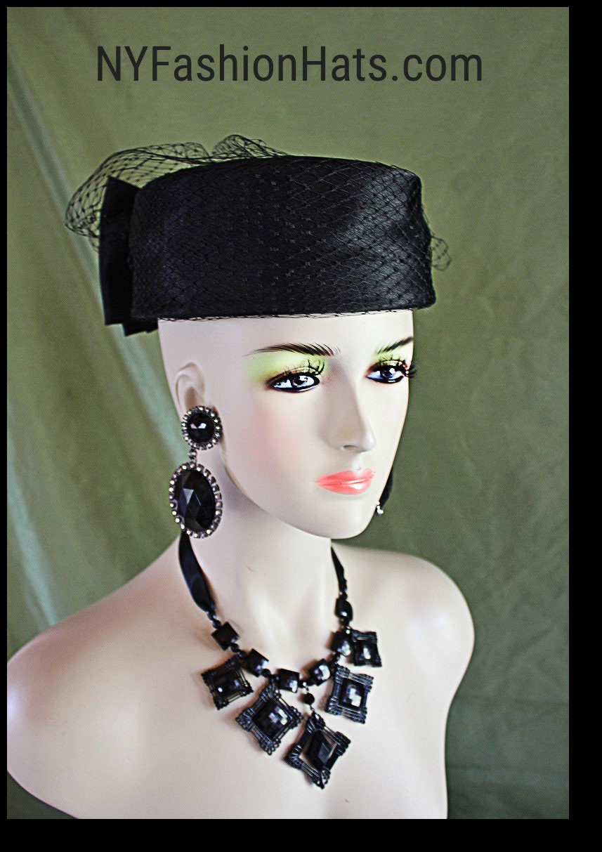 Women’s Black Designer Satin Formal Pillbox Bridal Wedding Hat. This Cocktail Hat Is Embellished With A Satin Bow And Birdcage Netting Around The Side And Top Of The Crown. Note: The Netting Does Not Cover The Face. A Large Birdcage Netting Bow Is Placed Under A Triple Satin Bow For Classic Couture Styling. A Perfect Hat For A Bride Or Mother Of The Bride Or Groom. This Designer Fashion Church Hat Is Custom Made And Designed By NY Fashion Hats Custom Millinery Headwear. http://www.nyfashionhats.com