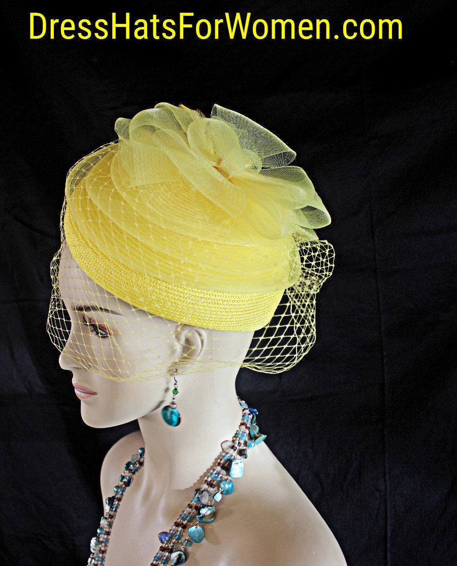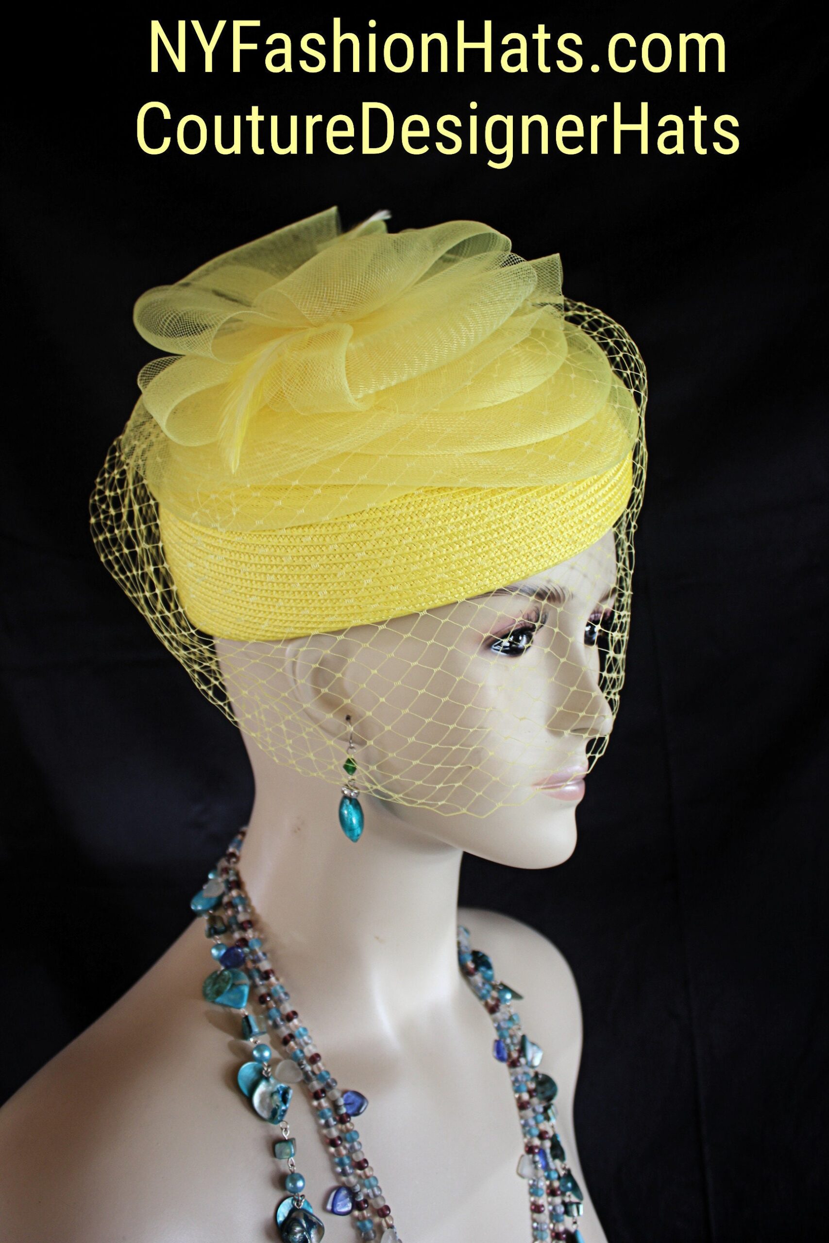 Ladies Hand Made Yellow Pillbox Couture Designer Hat With A Face Veil. This Exclusive Fashion Hat Is Trimmed With A Birdcage Face Netting Veil. The Top Of The Hat Is Trimmed With A Horsehair Crinoline Netting Bow. This Versatile Hat Can Be Worn In Different Positions To Complement Your Facial Structure. The Veil Can Be Worn To Cover The Face Partially. This Hat Is A Show Stopper And Will Make A Fashion Statement. This Flattering Hat Is Suited For Winter, Spring, Summer Or Fall.