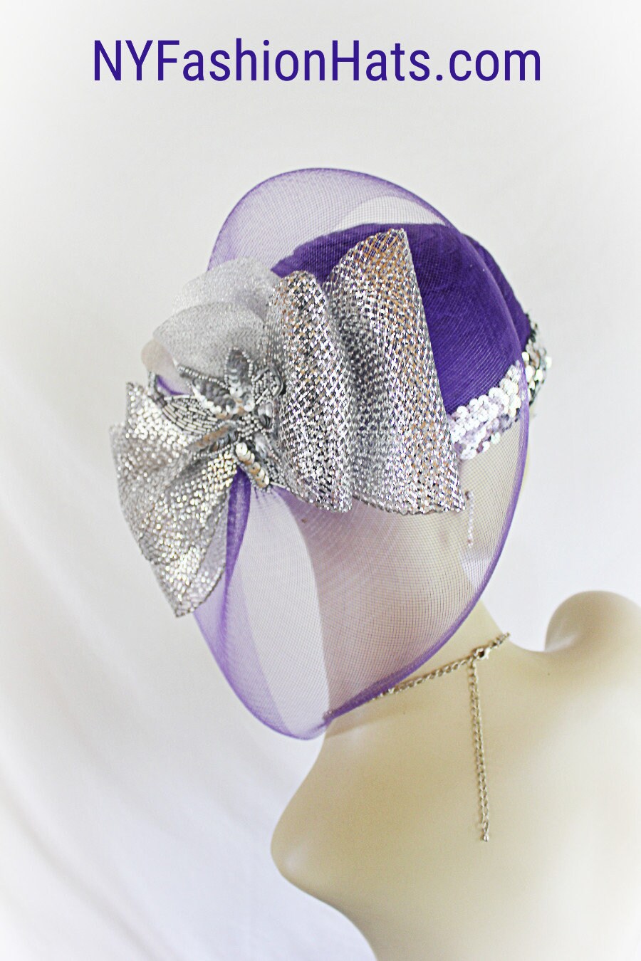 Haute Couture Purple And Metallic Silver Pillbox Church Wedding Bridal Cocktail Hat Headpiece Fascinator. The Purple Bow Can Be Used As A Partial Veil As A Face Covering. This Formal Purple Horsehair Scallop Braid Hat Is Embellished With A Large Purple Crinoline Horsehair And Metallic Silver Bow.