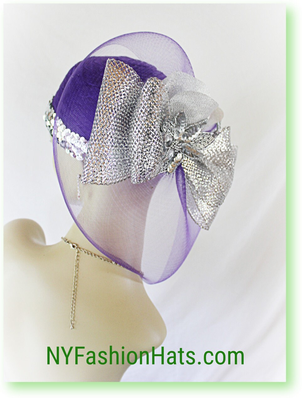 A Beautiful Sprayed Metallic Silver Sequin Glassed Beaded Pearl Applique Is Placed Within The Bow. A Decorative Metallic Silver Sequin Trim Encircles The Lower Portion Of This Fashion Hat. Metallic Silver Vintage Flower Petals Are Placed Within The Bow For A Vintage Appearance. NOTE: This Versatile Hat Can Be Worn In Different Positions. The Bowing Can Be Worn Toward The Face Or Toward The Back Of The Head.