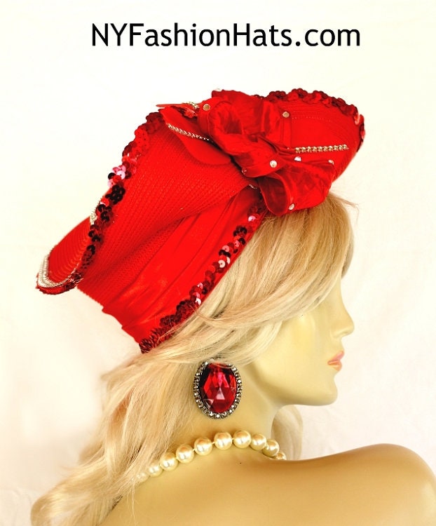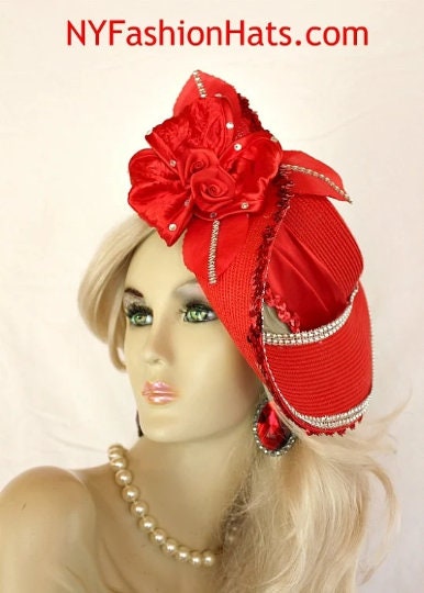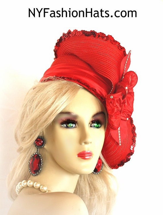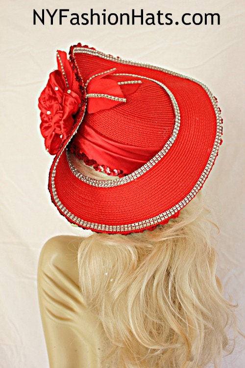 Women’s Red Sculptured Haute Couture Custom Made Satin Flowered Silk Rosette Hat Embellished With A Shaped Red Contoured Brim. Red Sequin And Acrylic Rhinestones Wraps Around The Edge Of This Unusual Shaped Brim. The Crown Of This Hat Is Embellished With A Satin Band As Well As The Same Beautiful Red Sequin Trim. The Red Flower Is Made Of Red Satin And Trimmed With Vintage Red Silk Millinery Leaves Adorned With Rhinestones. The Center Of The Flower Contains Red Satin Rosettes. Loose Rhinestones Are Placed Within The Flower. This Bridal Mother Of The Bride Headpiece Can Be Worn With Embellishments Toward The Face, Side Of The Face Or To The Back Of The Head. This Formal 1920’s Flapper Art Deco Styled Hat Wedding Headpiece Can Be Worn In Different Positions. Custom Made And Designed By NY Fashion Hats Couture Millinery. https://www.nyfashionhats.com –
