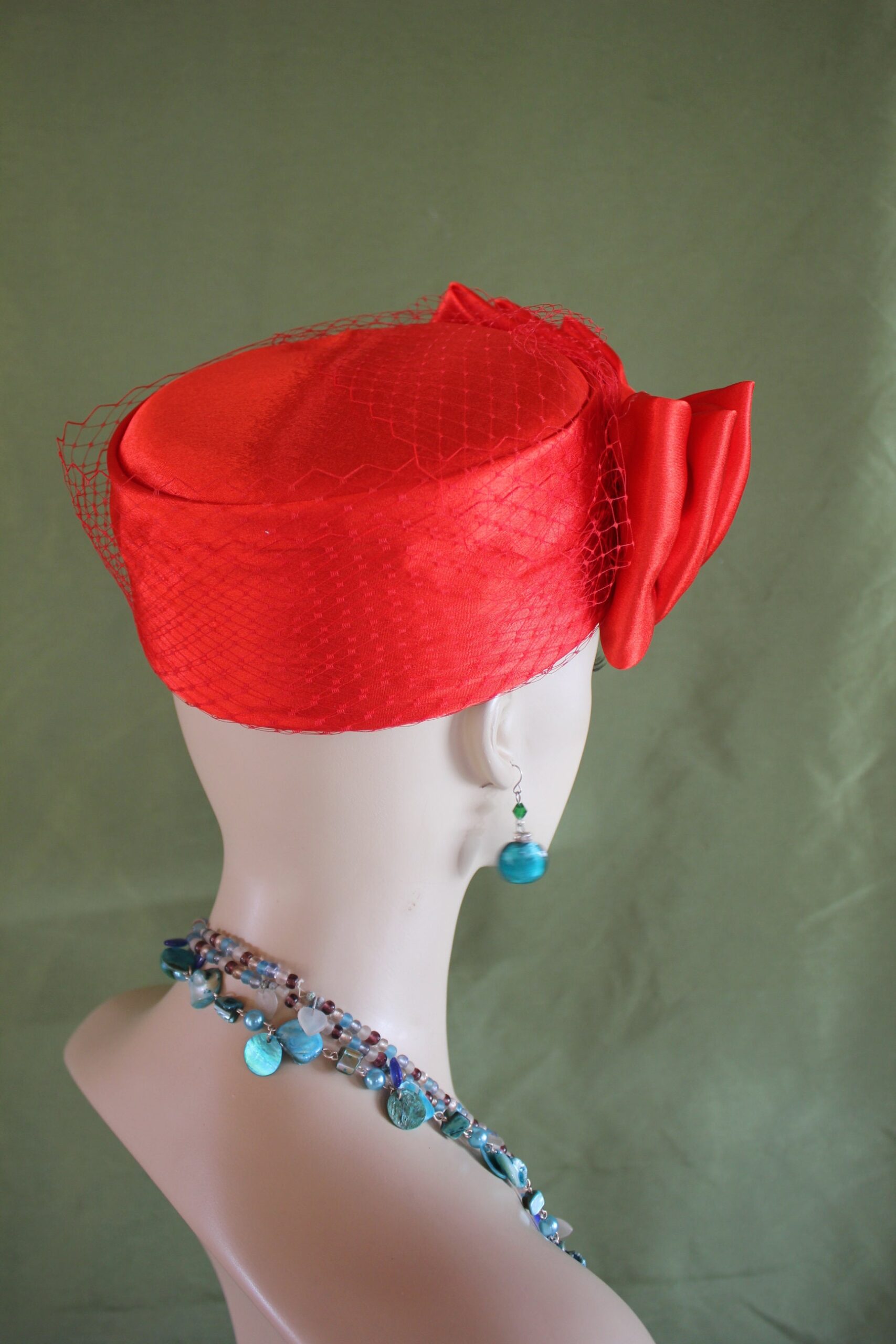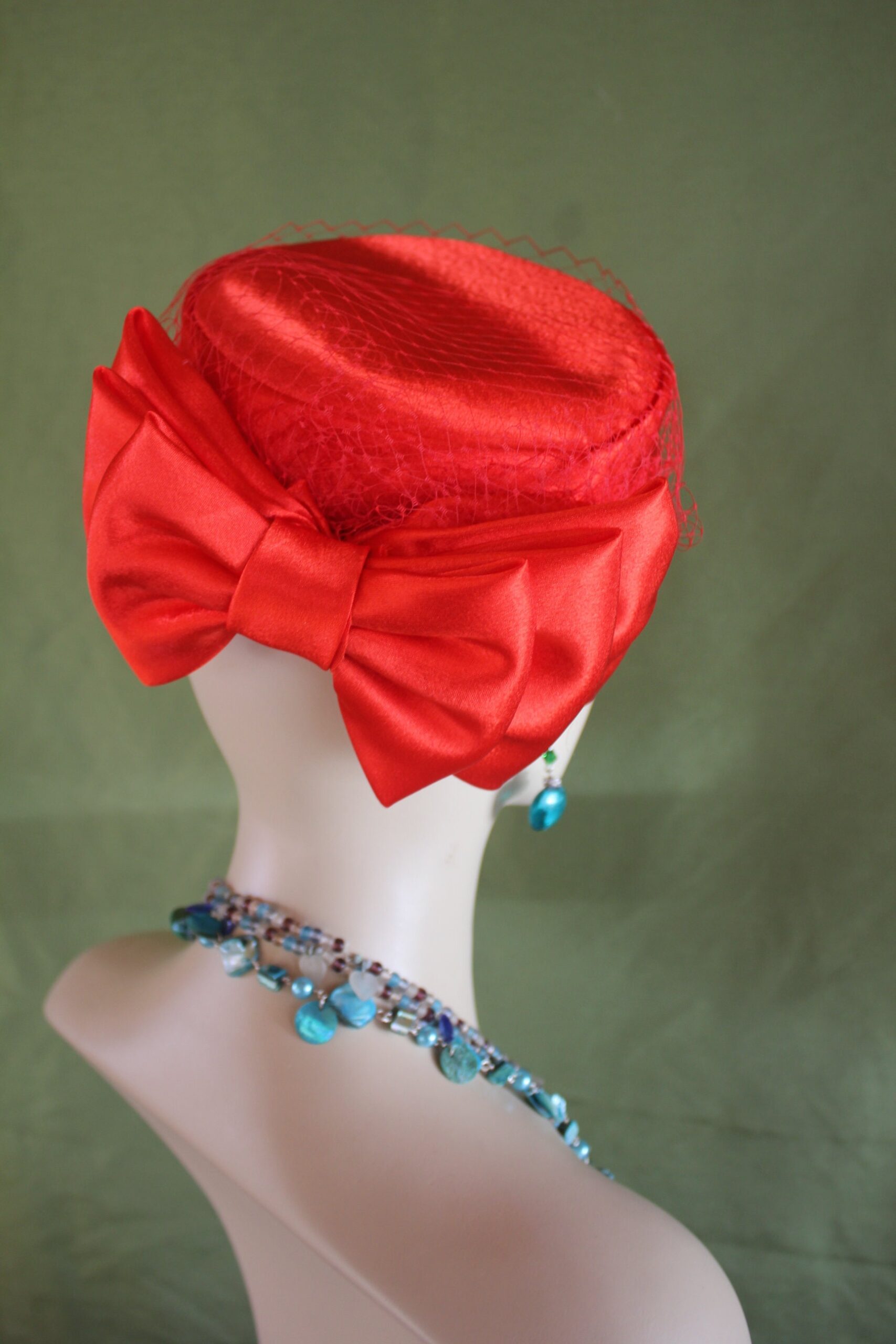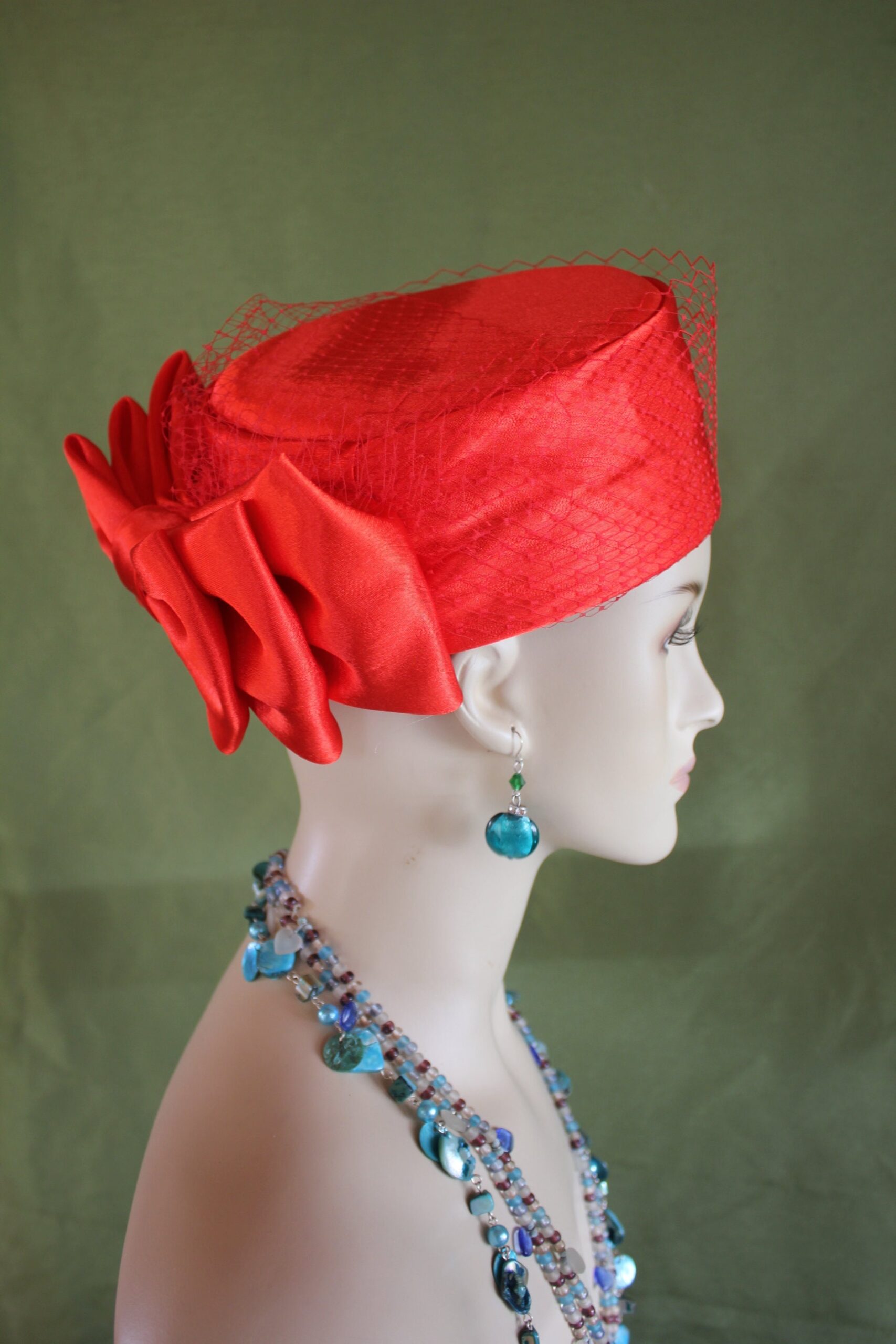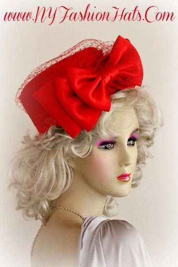 Ladies Red Designer Satin Pillbox Bridal Wedding Hat Embellished With A Satin Bow And Birdcage Netting Veil On Top Of Hat. Note Veil Does Not Cover The Face. A Perfect Hat For A Bride Or Mother Of The Bride Or Groom. This Designer Fashion Church Hat Is Custom Made And Designed By NY Fashion Hats Custom Millinery Headwear. http://www.nyfashionhats.com