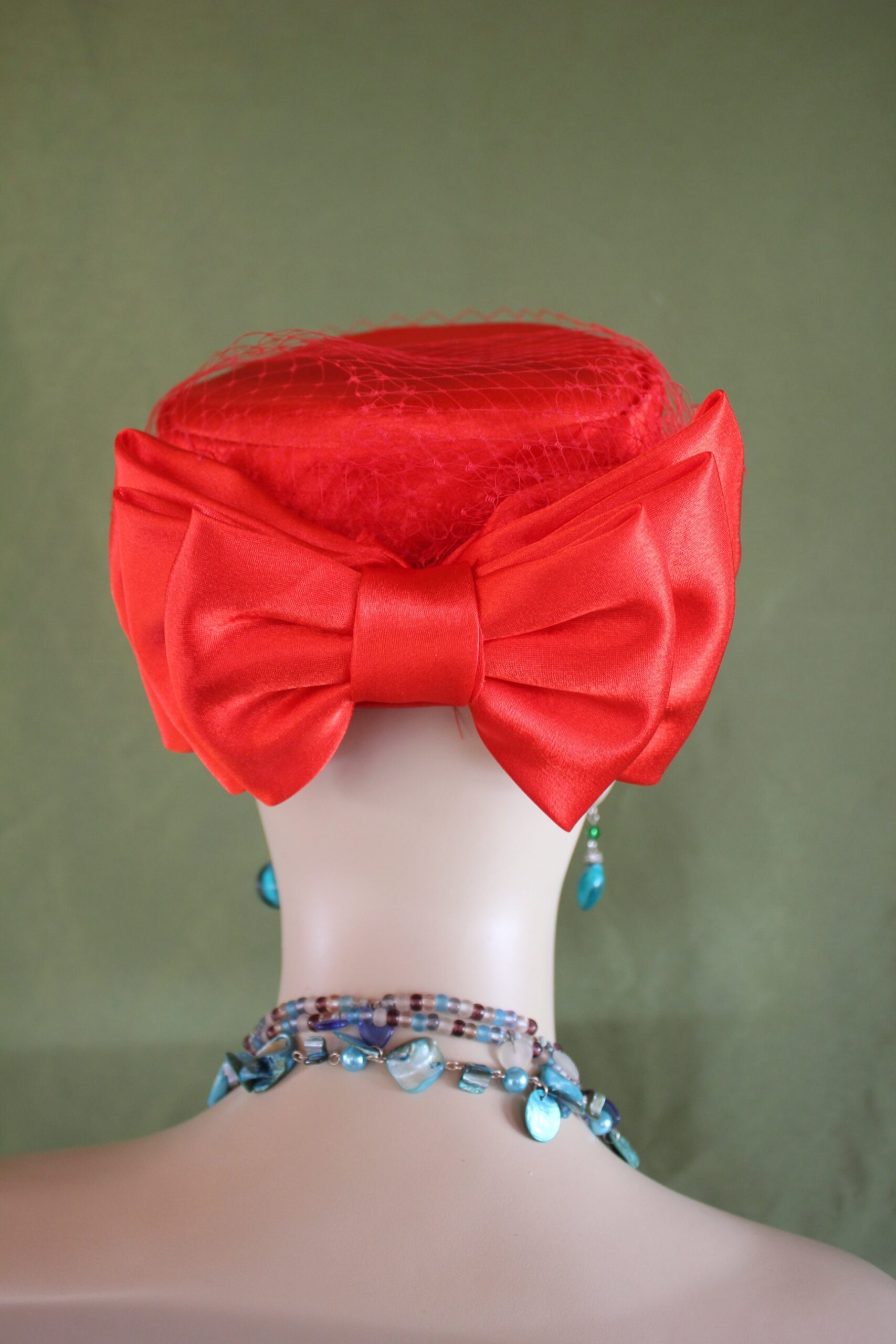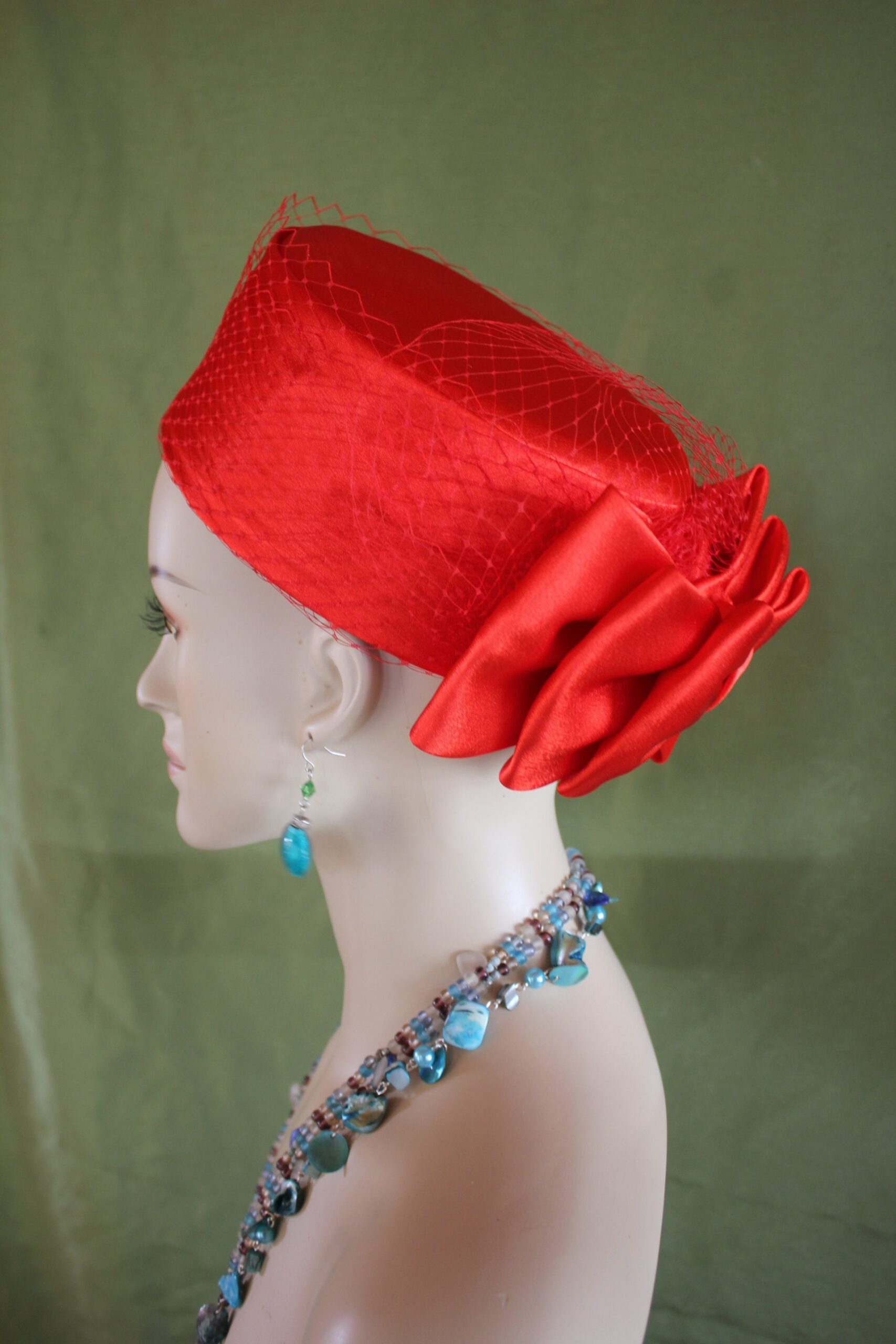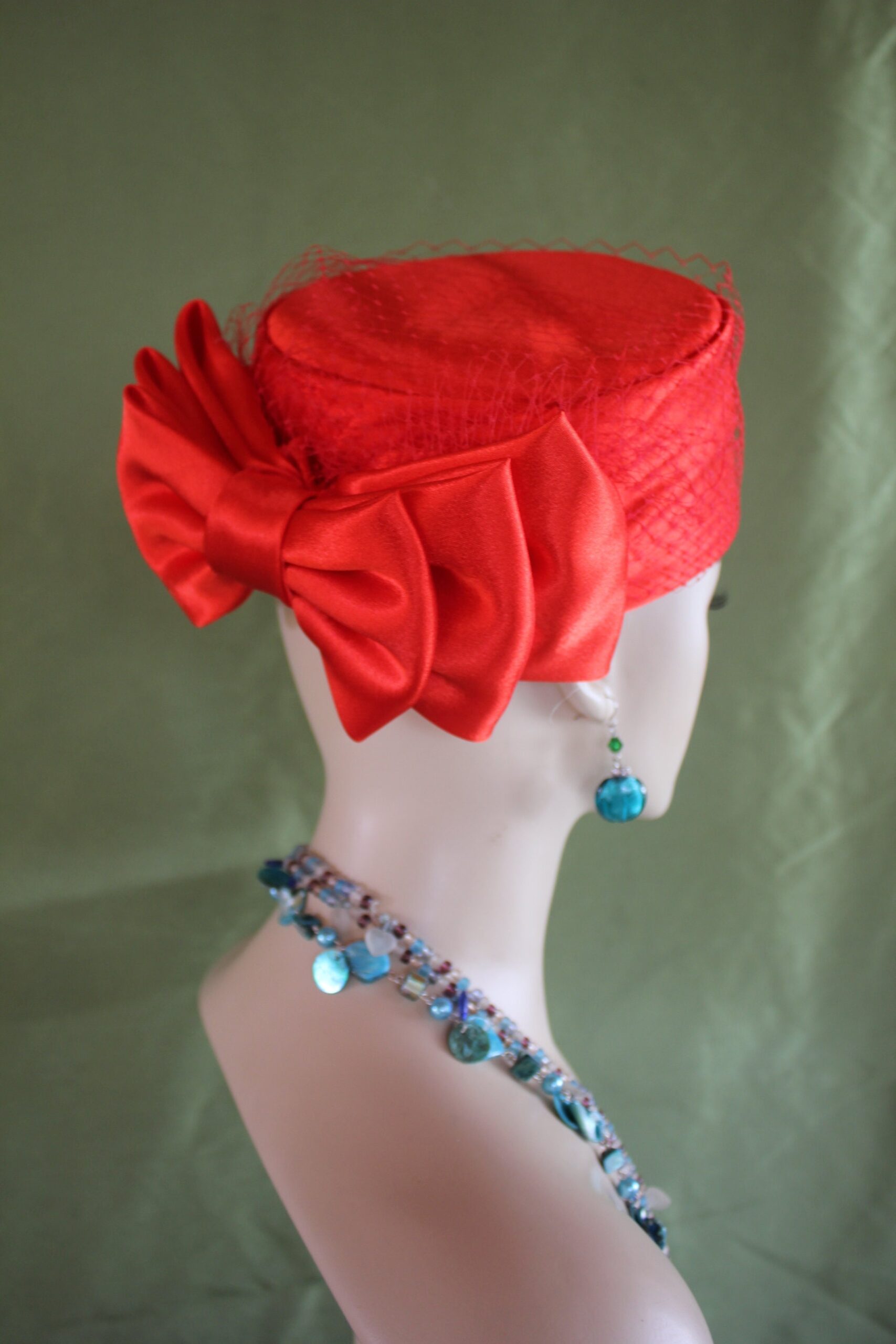 Ladies Red Designer Satin Pillbox Bridal Wedding Hat Embellished With A Satin Bow And Birdcage Netting Veil On Top Of Hat. Note Veil Does Not Cover The Face. A Perfect Hat For A Bride Or Mother Of The Bride Or Groom. This Designer Fashion Church Hat Is Custom Made And Designed By NY Fashion Hats Custom Millinery Headwear. http://www.nyfashionhats.com