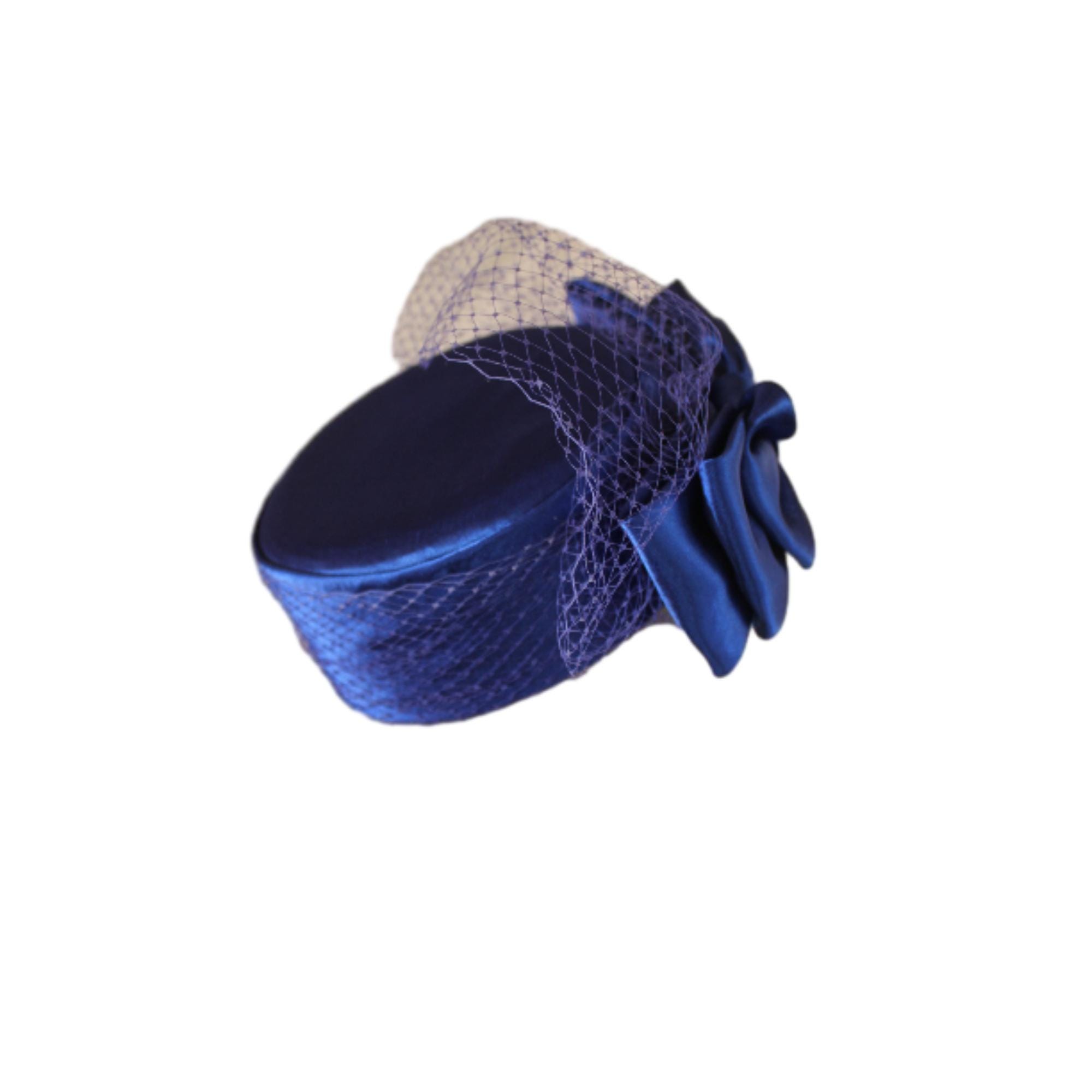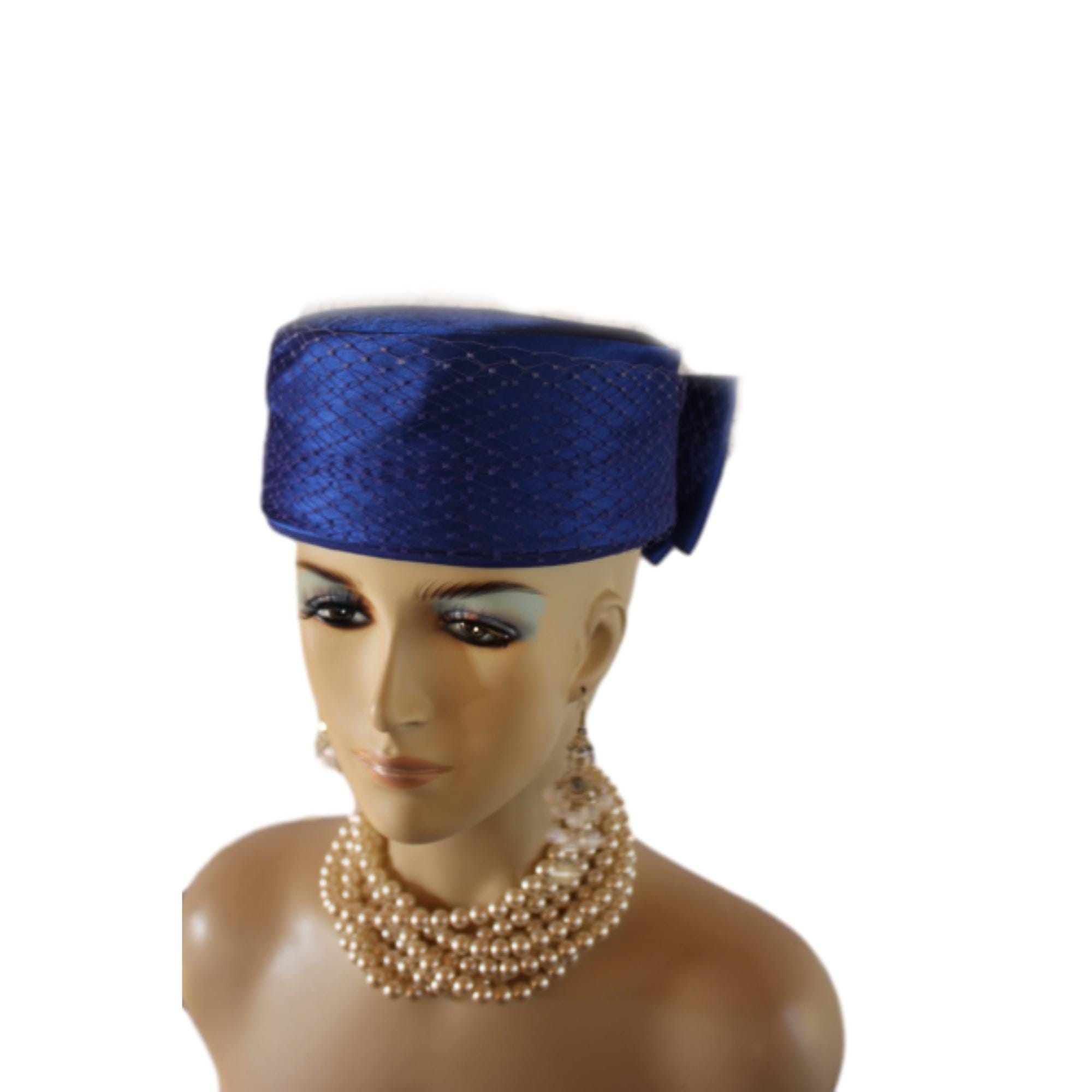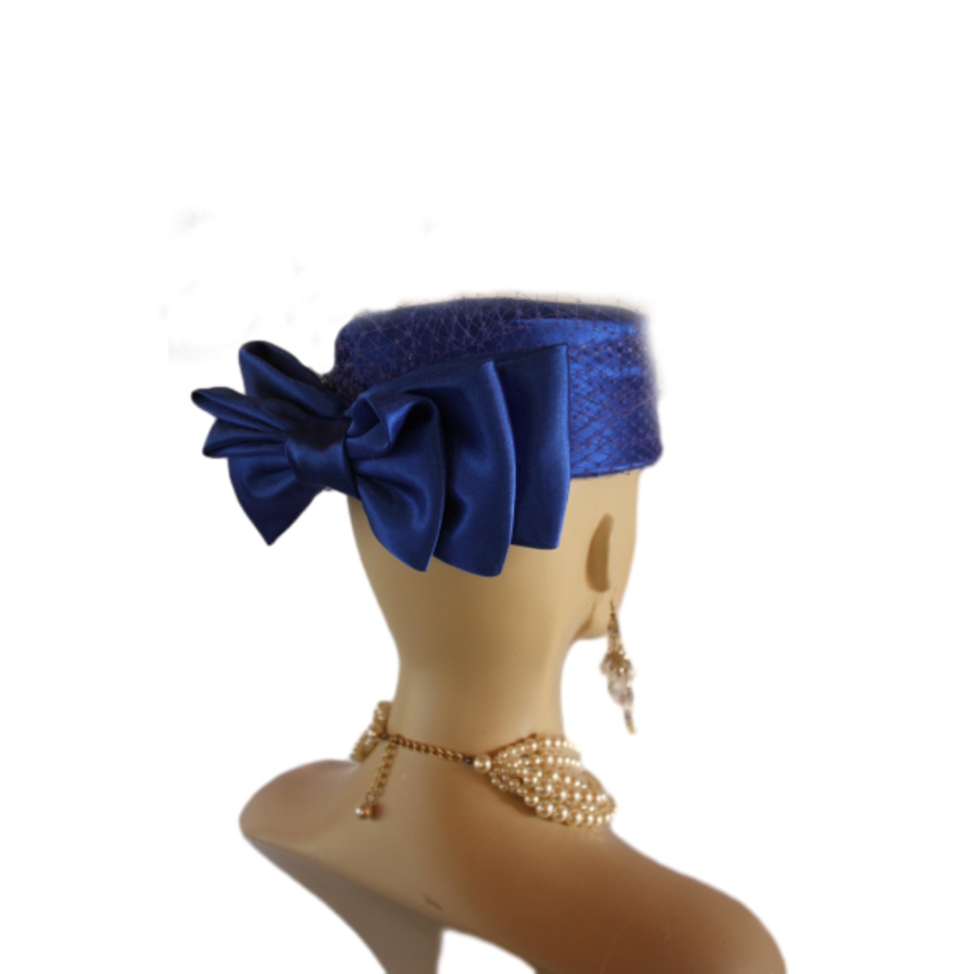 NY Fashion Hats Millinery Headwear Apparel,Square Crown Style Pillbox Hat,Birdcage Netting On Top Of Crown,Some Birdcage Netting On Hat,Couture Designer Bridal Hats For Women,Each Hat Is Custom Made Per Order,Mother Of The Bride Hat Headwear,Royal Blue Satin Pillbox Hat For Women,Large Royal Blue Satin Bow,Haute Couture Handmade Hats