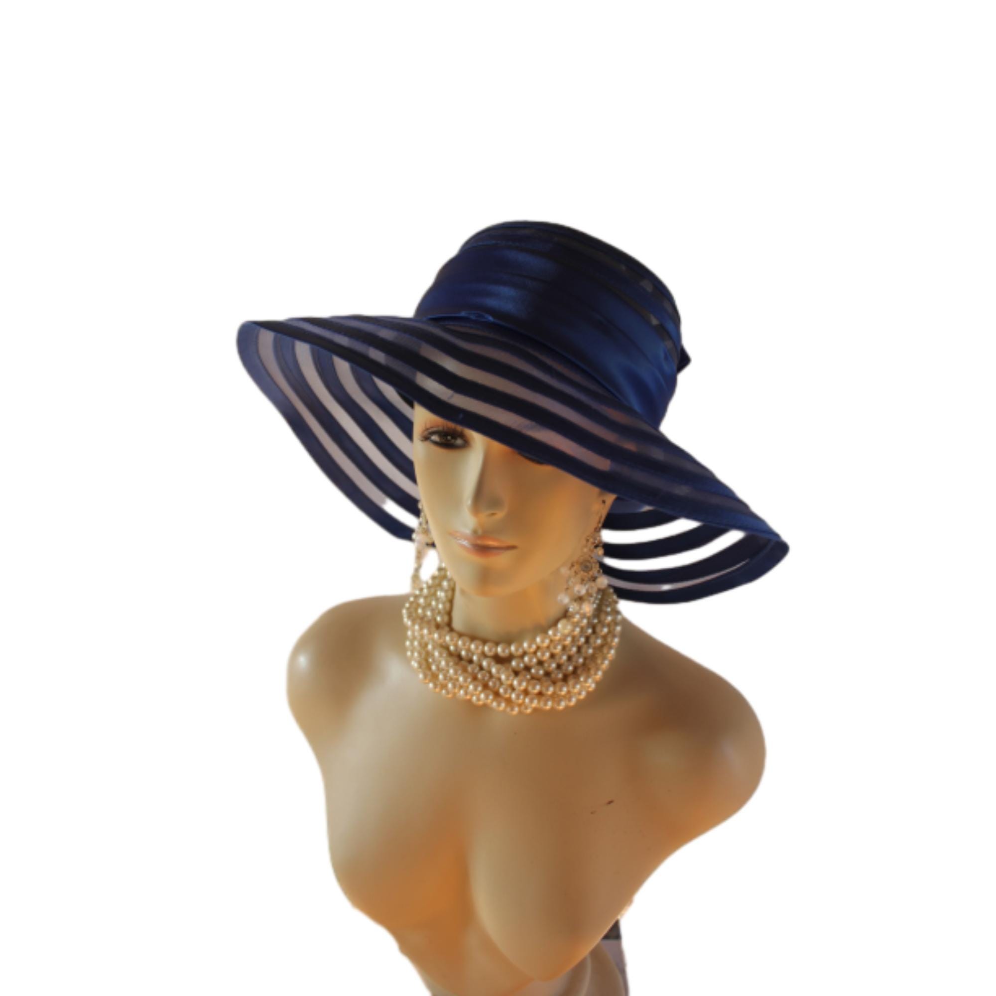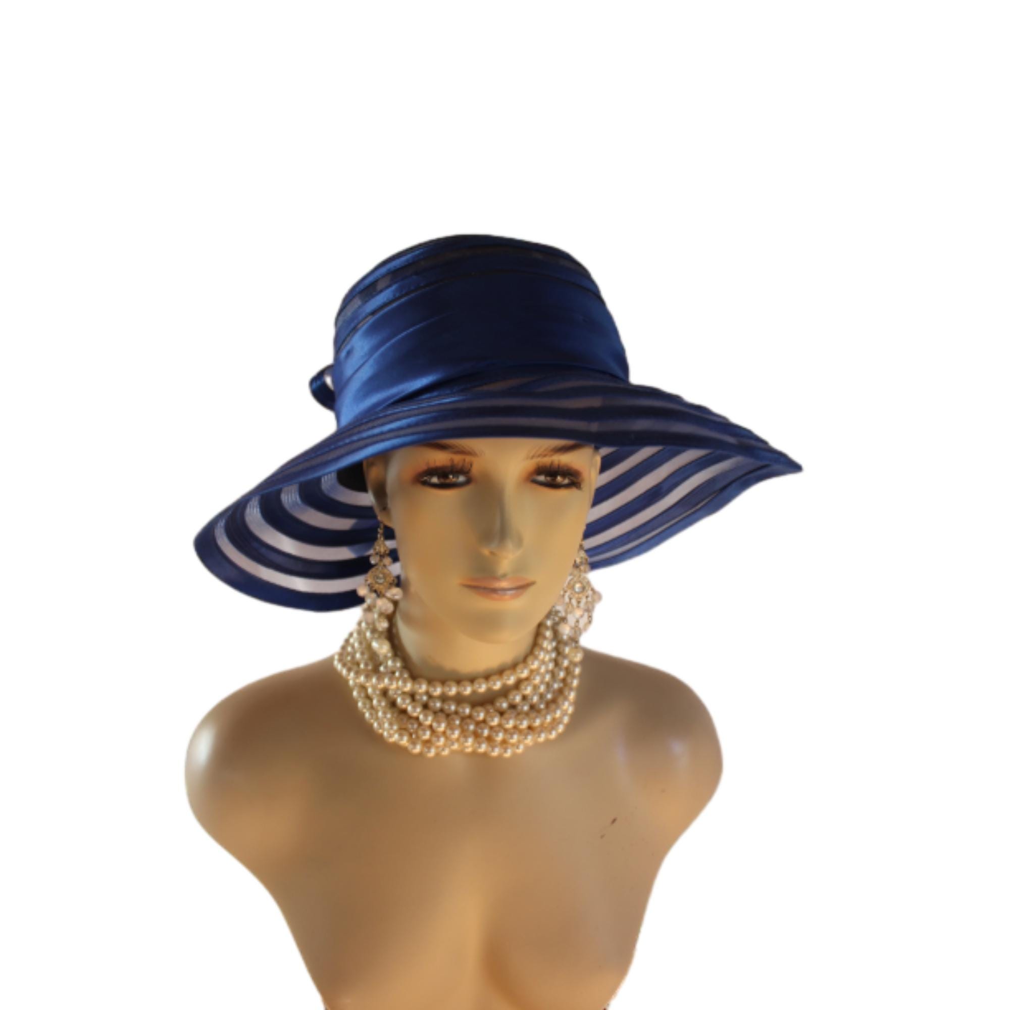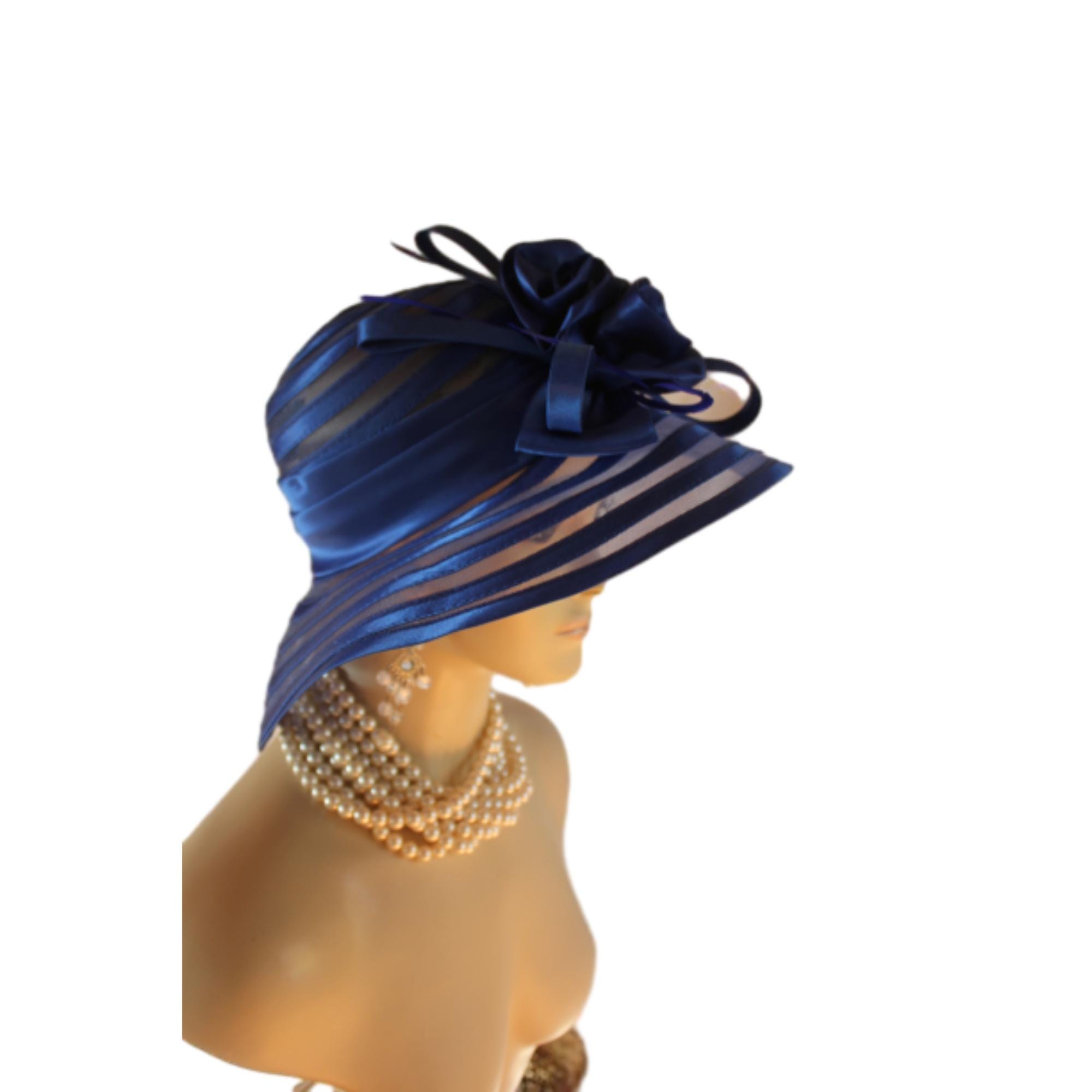 Women’s Formal Haute Couture Royal Navy Blue Colored Satin Floppy Satin Crinoline Wide Brim Dress Hat. This Hat Is Well Suite For Mother Of The Bride Or Groom.