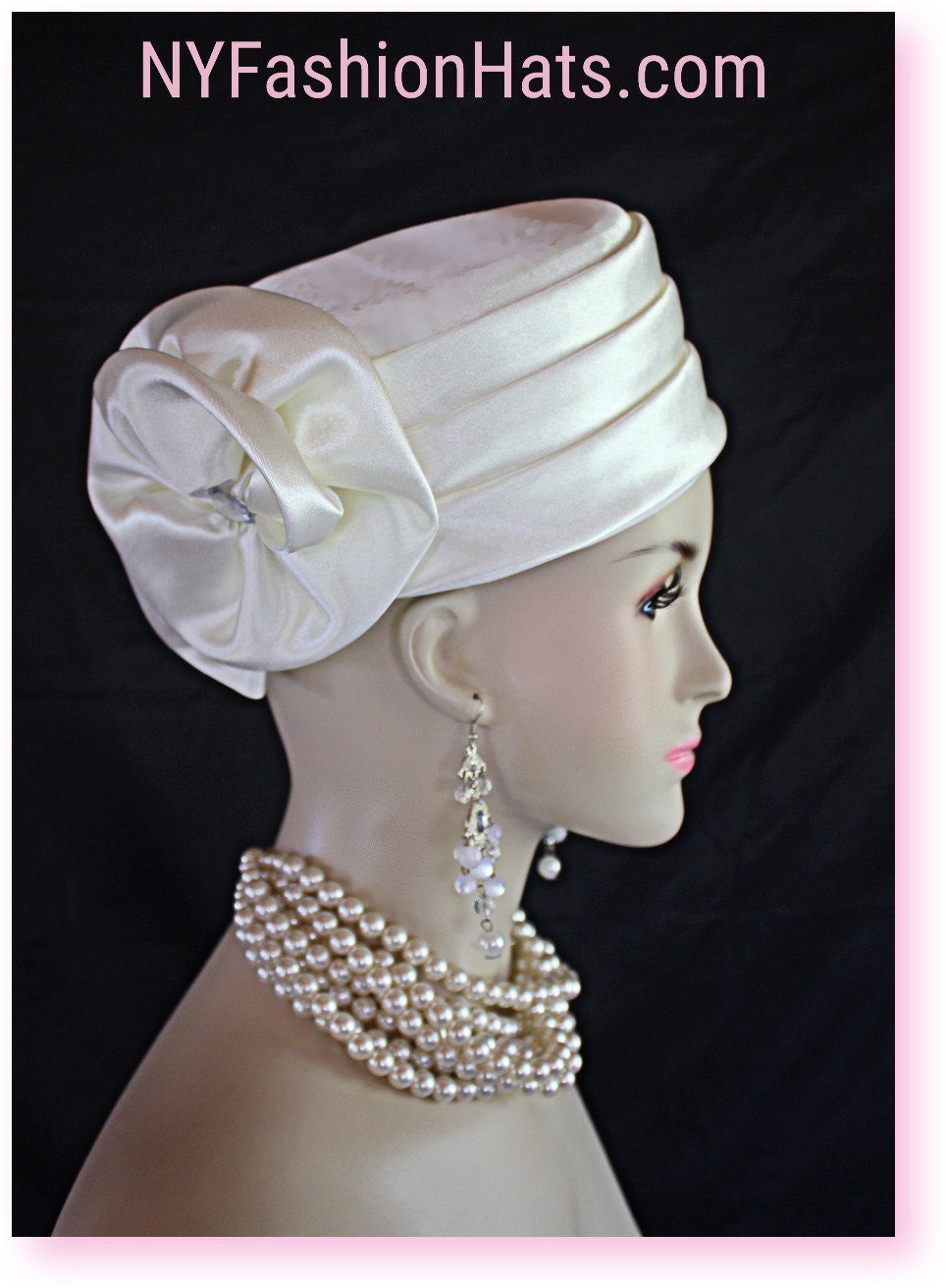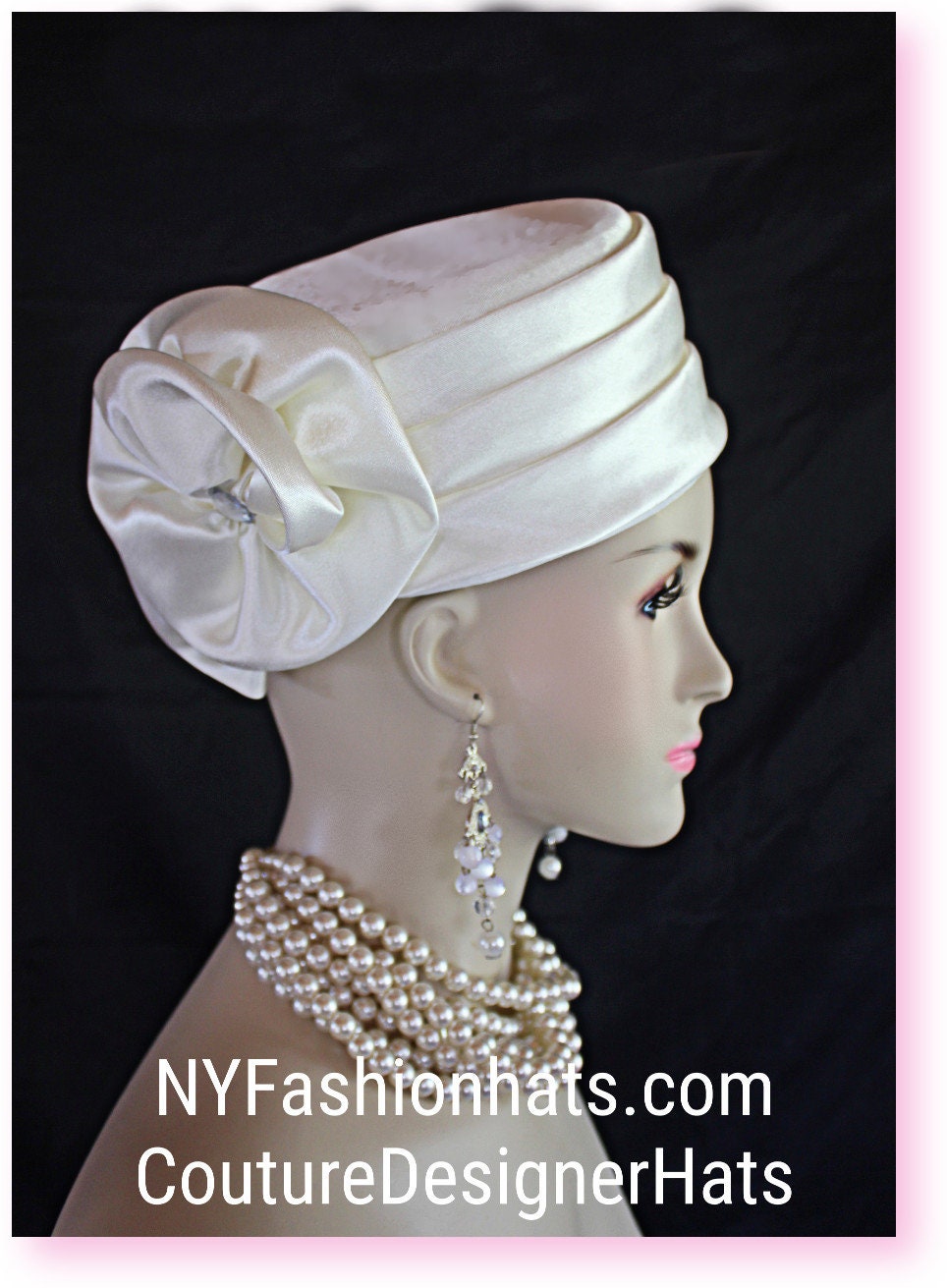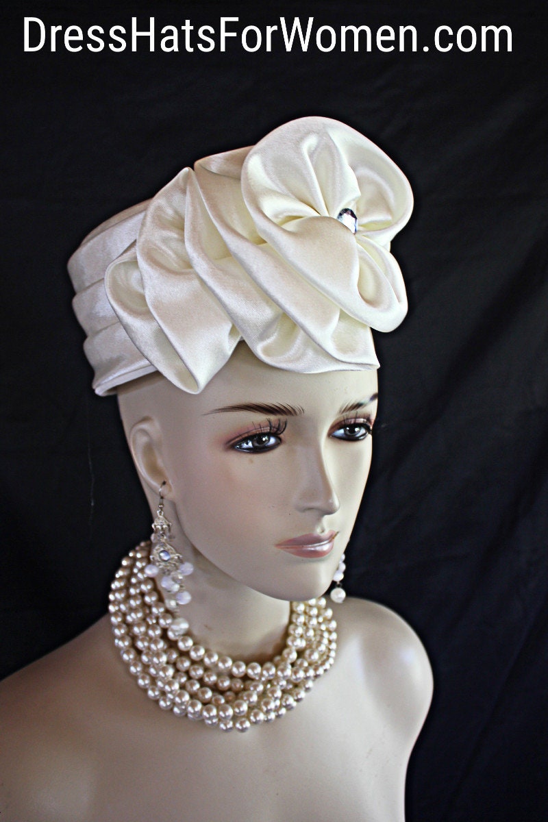 Women’s Soft Beige Or Ivory Satin Couture Formal Pillbox Cocktail Wedding Church Hat. This Classic Styled Dressy Pillbox Holiday Hat Is Embellished With A Satin Bow Enhanced With A Rhinestone. This Bridal Mother Of The Bride Headpiece Can Be Worn With Embellishments Toward The Face Or To The Back Of The Head. This Elegant Satin Pillbox Hat Is Custom Made And Designed By NY Fashion Hats Couture Millinery. https://www.nyfashionhats.com. This New Collection Headpiece Is Part Of The Anastasia Konstandina Couture Headdress Line.