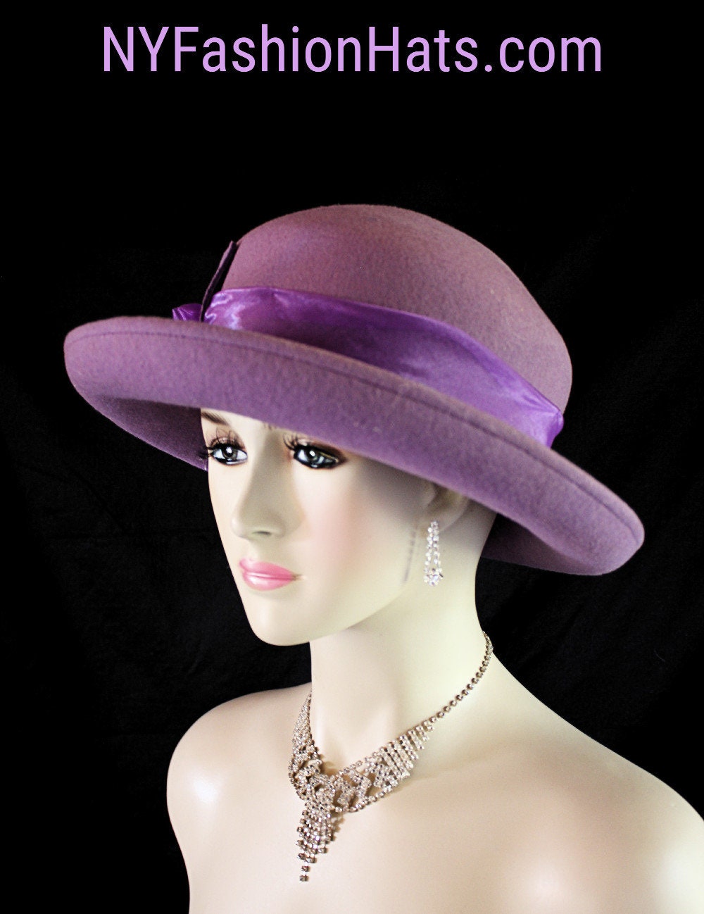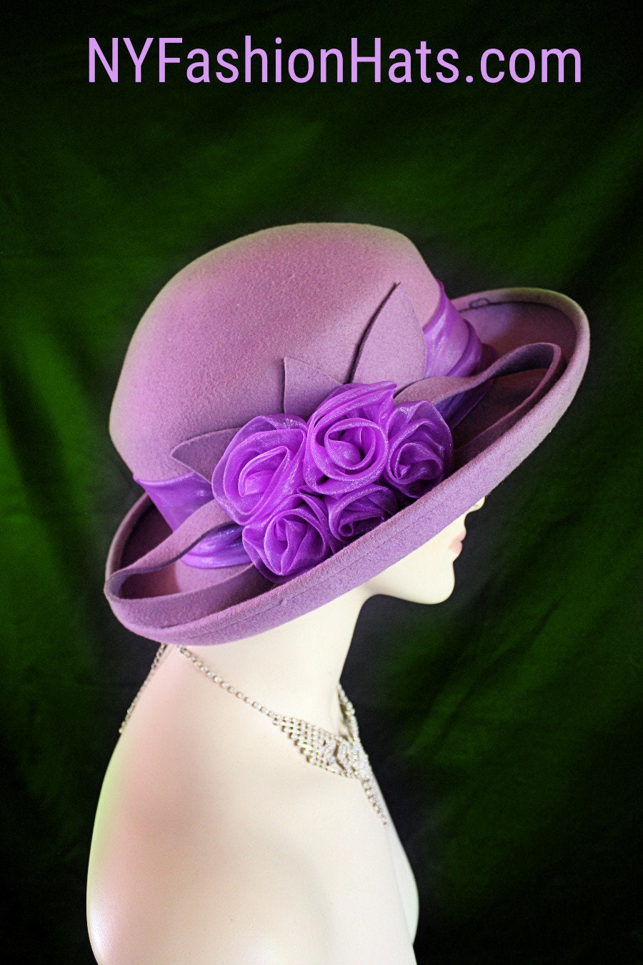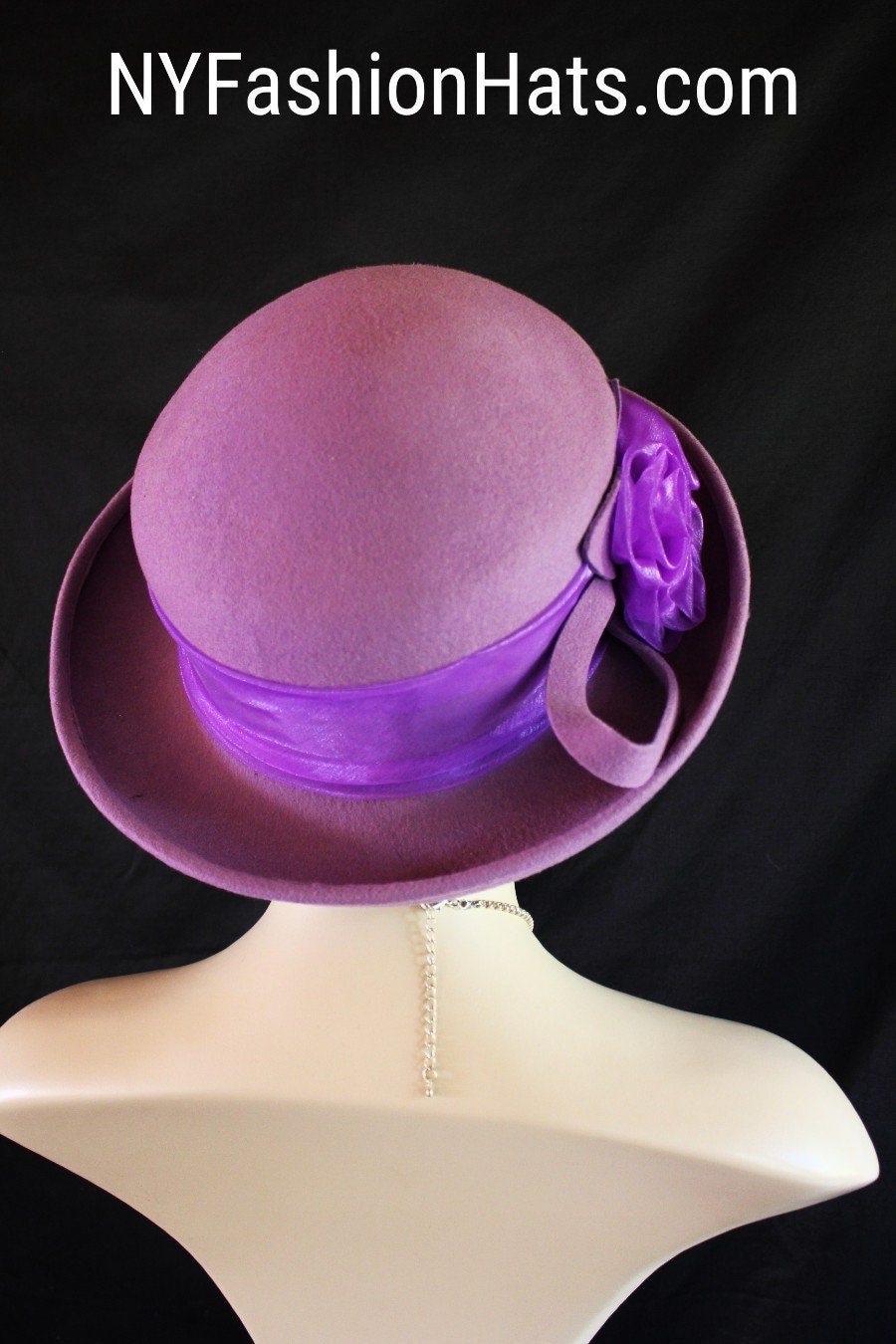 Dusty Soft Purple Winter Wool Roll Up Bowler Derby Brim Designer Organza Rosette Bow Fashion Hat For Women. This Elegant Purple Hat Is Embellished With A Wool Loop Bow Enhanced With Wool Floral Millinery Leaves. Handmade Organza Rosettes Are Placed With The Bow. A Purple Organza Hat Band Encircles The Crown Of This Simple Yet Very Elegant Dress Hat. This Stylish Wool Hat Can Also Be Work As A Casual Statement Piece.