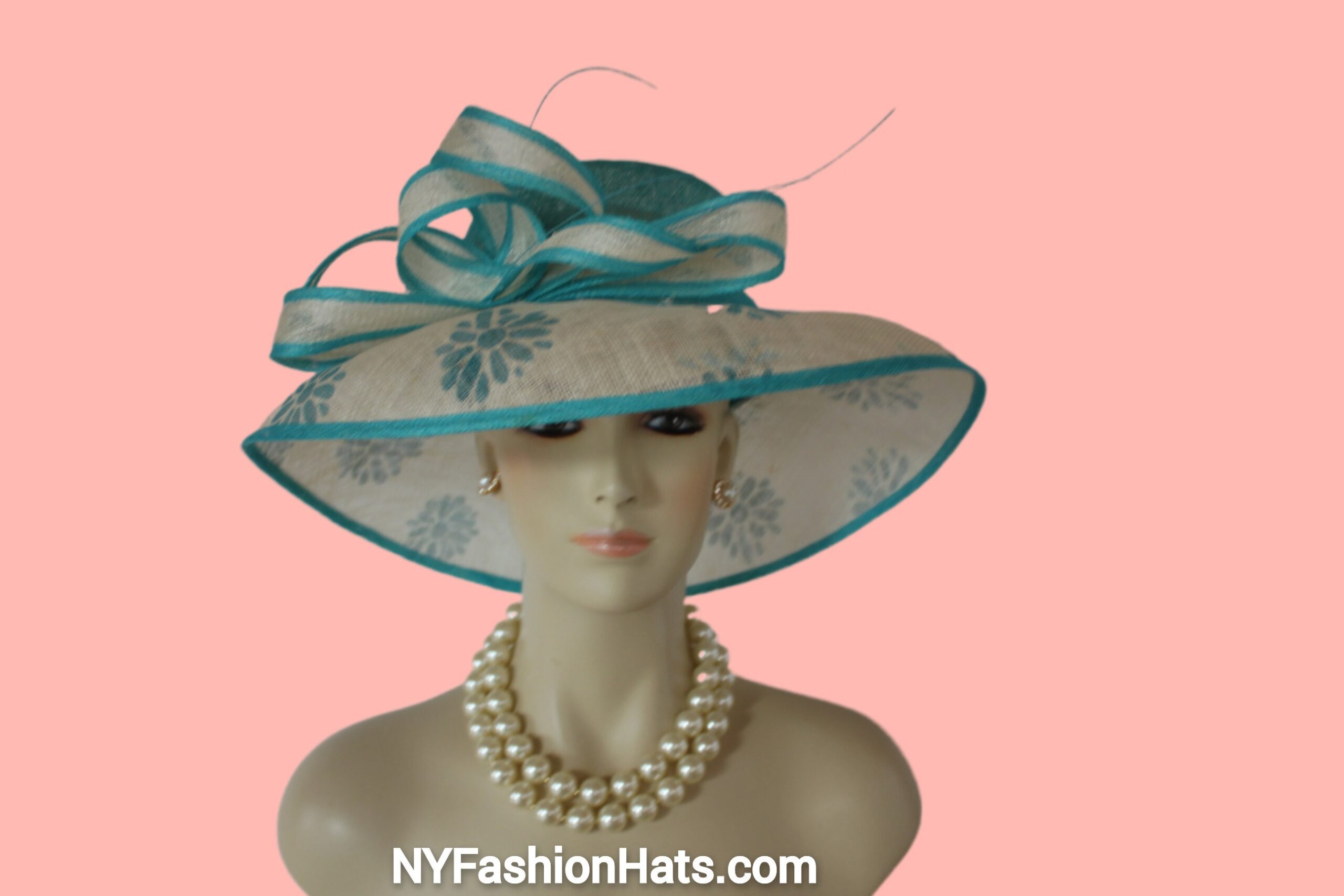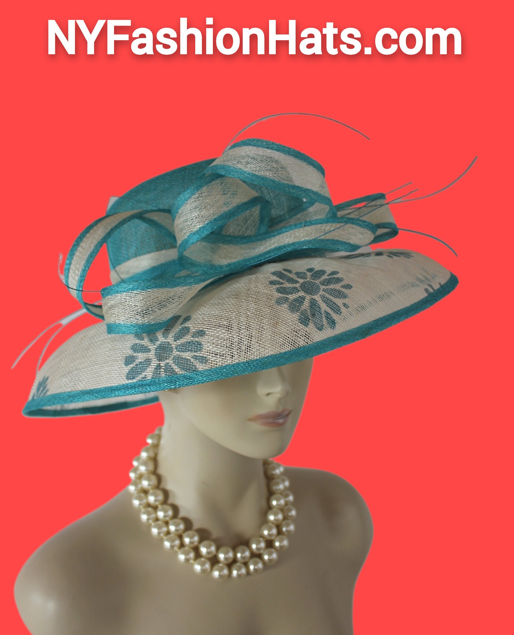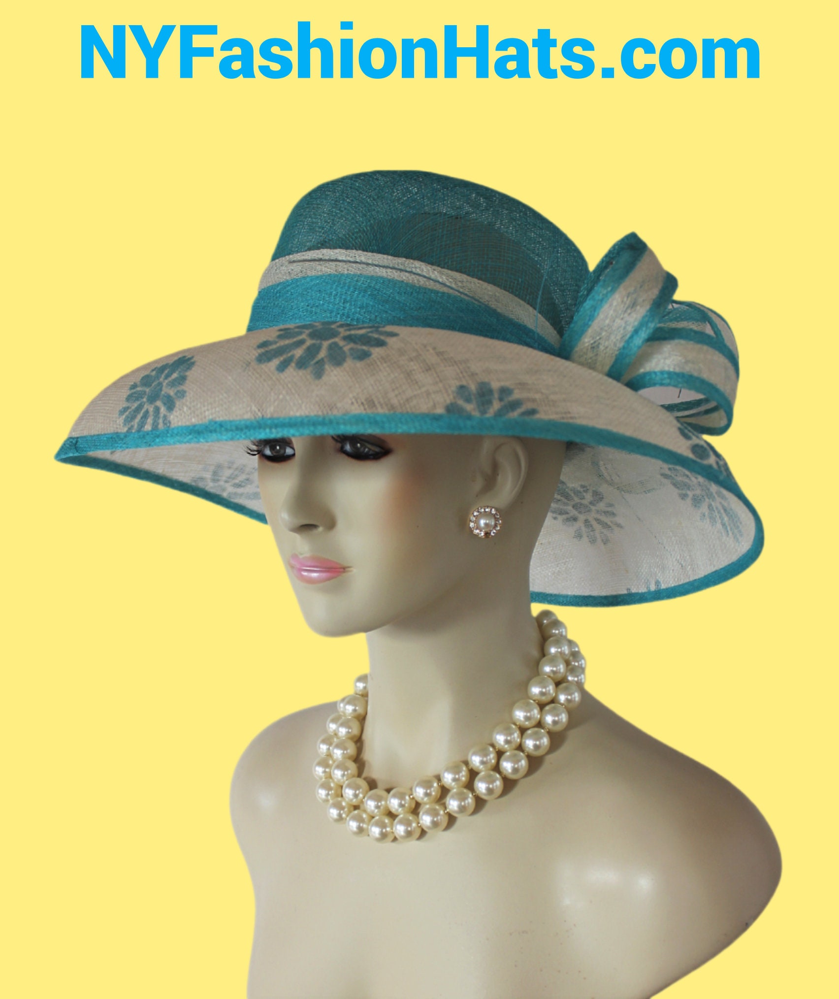 Women’s Formal Haute Couture Big Brim Turquoise Blue And Natural Beige Ivory Sinamay Straw Fashion Hat. This Decorative Wide Printed Brim Kentucky Derby Hat Is Embellished With A Large Bow And Embellishments. Simpily Feminine And Romantic.