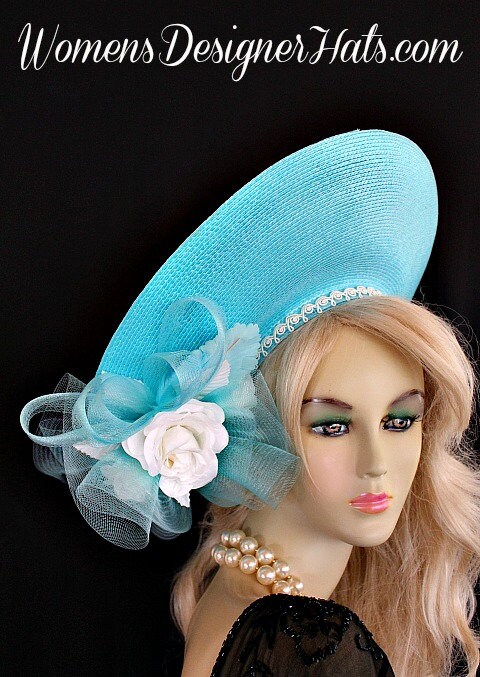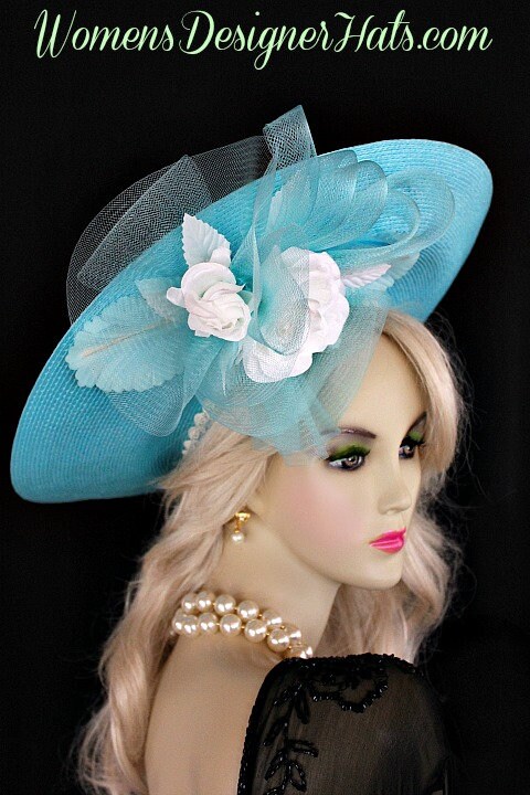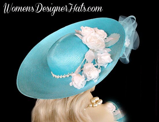 Turquoise Blue Haute Couture Avant Garde Designer Fashion Hat With A Lift Up Brim For Women. This Designer Dress Hat Is Trimmed With A Large Turquoise Blue Crin Rosette Bow, Adorned With White Silk Millinery Roses And Aqua Millinery Silk Leaves. The Same Roses And Leaves Are Placed On The Back Of This Wide Brim Hat. A White Intricate Trim Wraps Around The Crown Of This Hat.