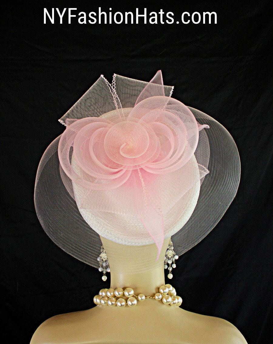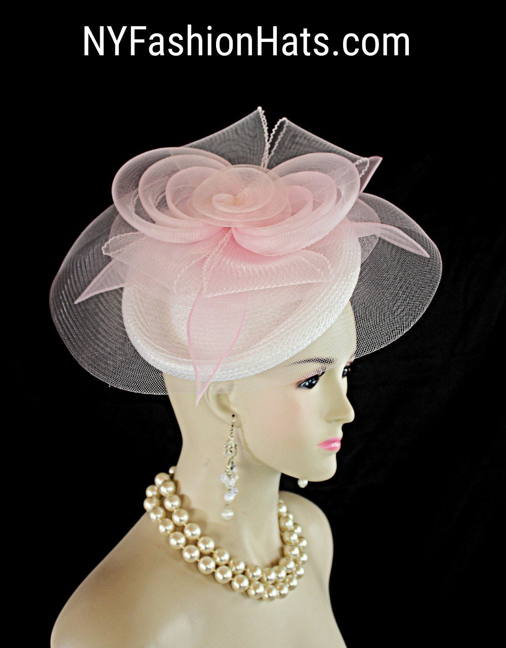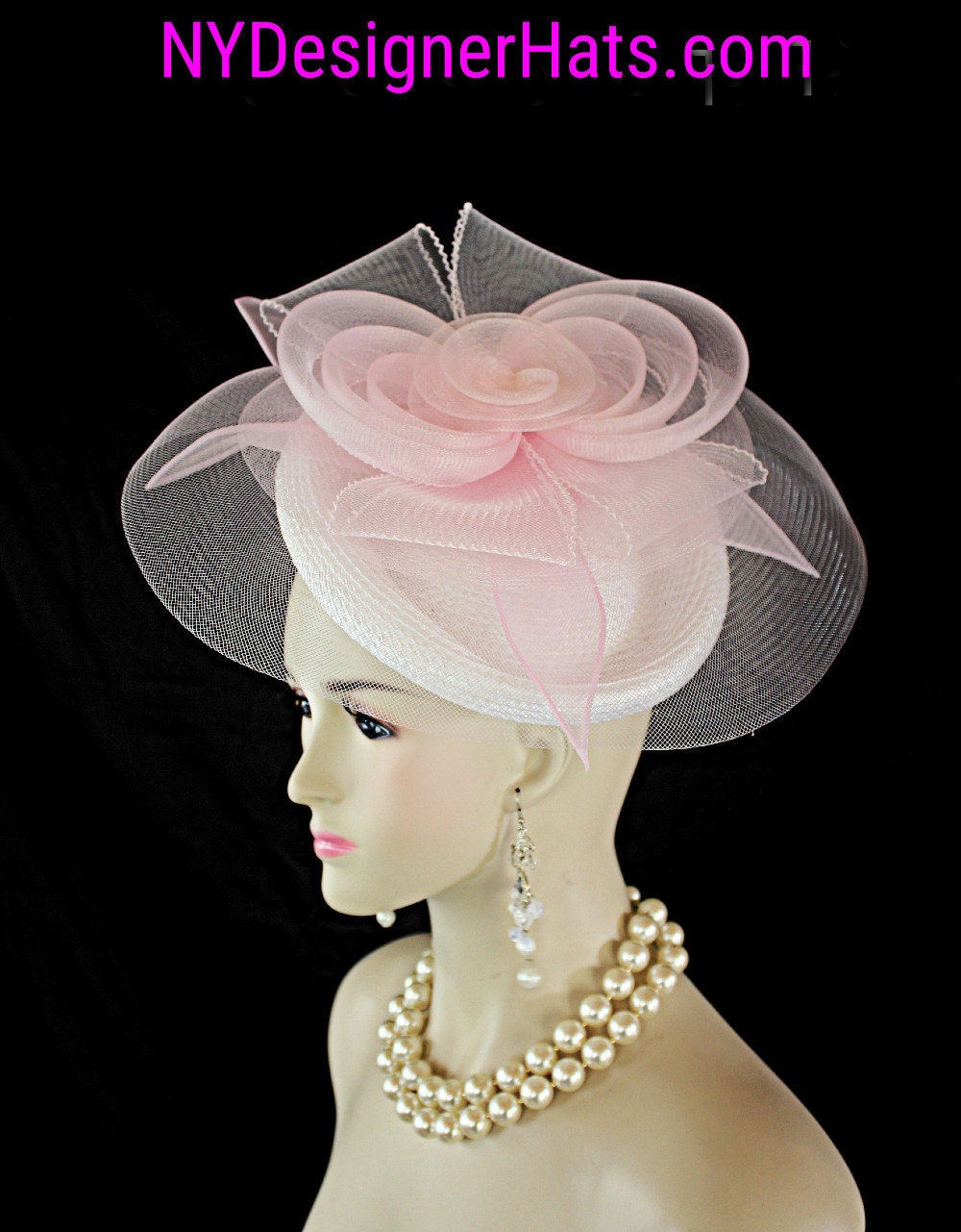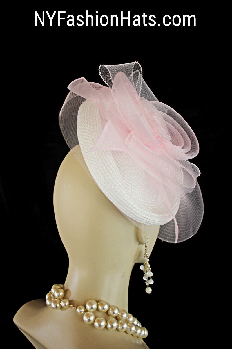 Women’s Ladies Hatue Couture Statement White And Baby Pink Saucer Designer Fascinator Hat Bridal Wedding Formal Statement Headpiece. This Formal Custom Made Dress Hat Is Embellished With A Large Sot Pink Bow Enhanced With Beautiful Vintage Organza Handmade Flower Petals. This Elegant Hat Is Suited For Church, Weddings, Brides, Formals, The Kentucky Derby, The Melbourne Cup, The Royal Ascot, Horse Races And Special Occasion. This Headpiece Is Made To Order. This Is A Custom Headpiece And Is Not Returnable. NOTE: This Headpiece Can Be Placed Where Desired On The Head.