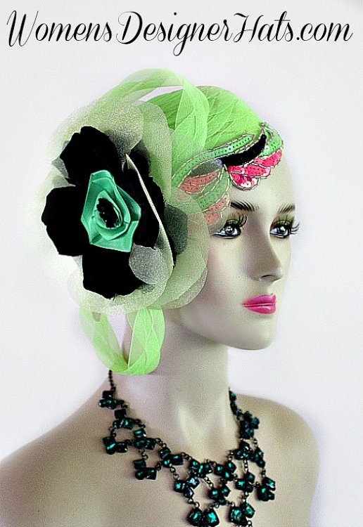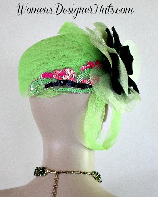 Lime Green Pillbox Cocktail Hat For Women With A Large Bow And Flower. Hand Made 1920’s Flapper Era Designer Fashion Hat – Trimmed With A Large Lime Green Bow, Accented With Handmade Black Silk And Soft Celery Lime Organza Vintage Millinery Flower. A Large Handmade Lime Green Satin Rosette Is Places Within The Flowers, Accented With A Black Sequin Rosette. This Fashion Hat Comes With A Hat Pin To Hold This Wedding Fascinator In Place. Two Beautiful Art Deco Lime Green, Black, And Hot Pink Sequin Beaded Glass Appliques Are Placed On This Headpiece. Measurements: 22.5″ Crown Size – Fits Most Women. New Condition – Custom Made Couture Fashion Hat – This Designer Fashion Hat Can Be Worn In Different Positions. Can Be Worn More Toward The Back Of The Head Or As A Cloche Fashion Hat. This Formal Pillbox Style Cocktail Hat Is Suited For Weddings, Church, Bridal Affairs, Formals, Horse Races, The Kentucky Derby, And Special Occasions.This Designer Custom Made Hat Is A Show Stopper. This Dress Hat Is Custom Made And Designed By Women’s Designer Hats, www.womens.designerhats.comAll Sales Are Final.