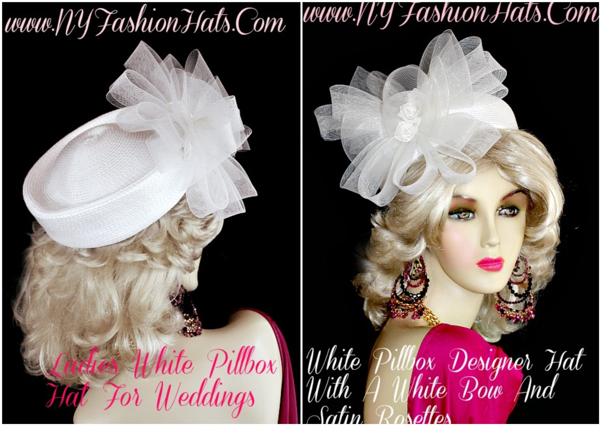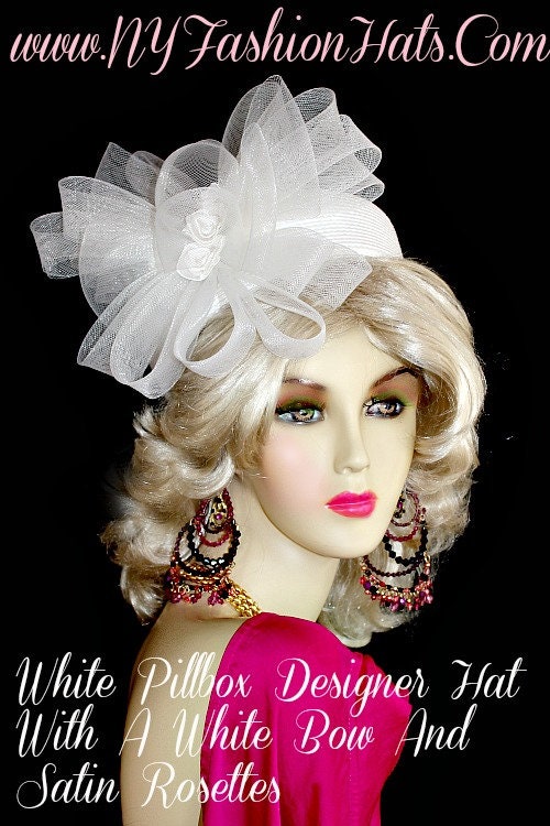 Motf Premium Classic Vintage Styled Ladies Hand Made Pure White Pillbox Designer Hat With A Large Dramatic Bow. This Exclusive Luxury Statement Fashion Hat Is Trimmed With A Custom Made White Horsehair Bow Accented With White Satin Rosettes Placed In The Center Of The Bow. This Versatile Hat Can Be Worn In Different Positions To Complement Your Facial Structure. The Large Bow Can Be Worn Toward The Face Or Toward The Back Of The Head. This Hat Is A Show Stopper And Will Make A Fashion Statement. This Flattering Hat Is Suited For Winter, Spring, Summer Or Fall. This Elegant Statement Headpiece Is Made By Couture Designer Hats A Subdivision Of NY Fashion Hats https://www.nyfashionhats.com Fine Millinery Headwear Apparel For Women